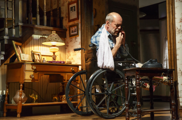 But in that same story, there lies a few big bear-traps that the playwright (William Goldman) and the director (Will Frears) got ensnared in. The biggest one, and one I fear got the best of them, was that the male lead, the famous writer Paul Sheldon (a game but disappointing Bruce Willis) is basically bedridden or at best, wheelchair-bound the whole play. For this to work on stage, that part needed a lot more help then James Caan did in the movie. Willis needs to engage us and we need to feel his fear, his pain, his anger, and his determination, all while staying stuck in bed or in that wheelchair. Caan had the use of closeups and film editing, but Willis does not have that luxury, and we feel that lack. This becomes the big fail in the play adaptation. Whether it’s coming from the play, the direction, or the performance, there was no escalation of fear and helplessness, nor did I feel the desperation, anxiety or stress as Paul’s situation worsens, especially in those scenes when he manages to escape the bedroom. Willis just fell flat.