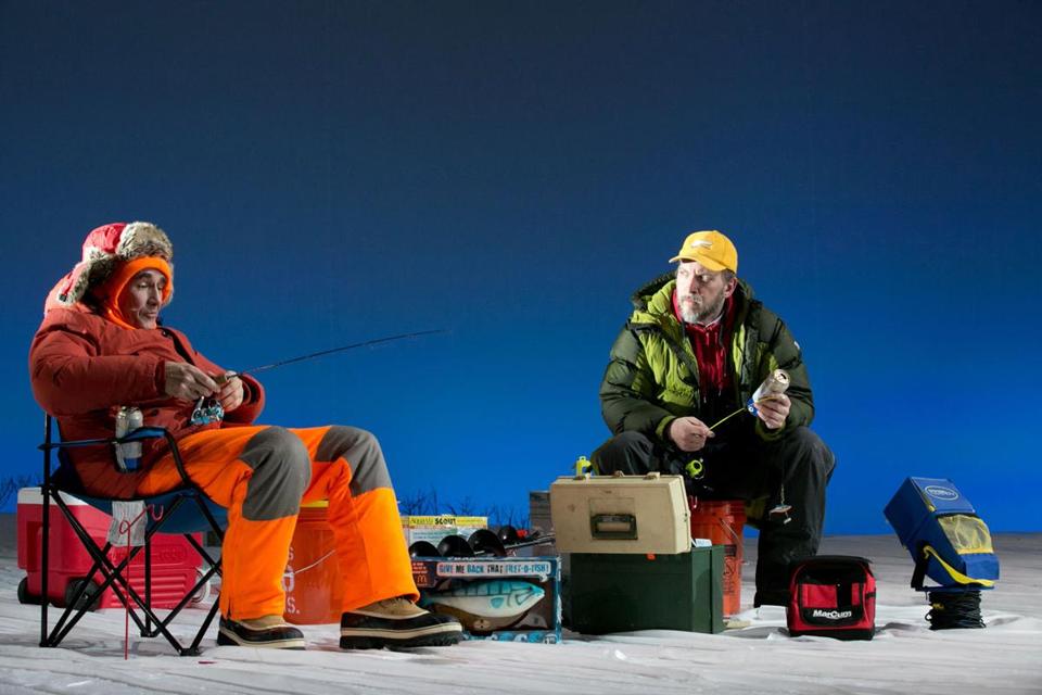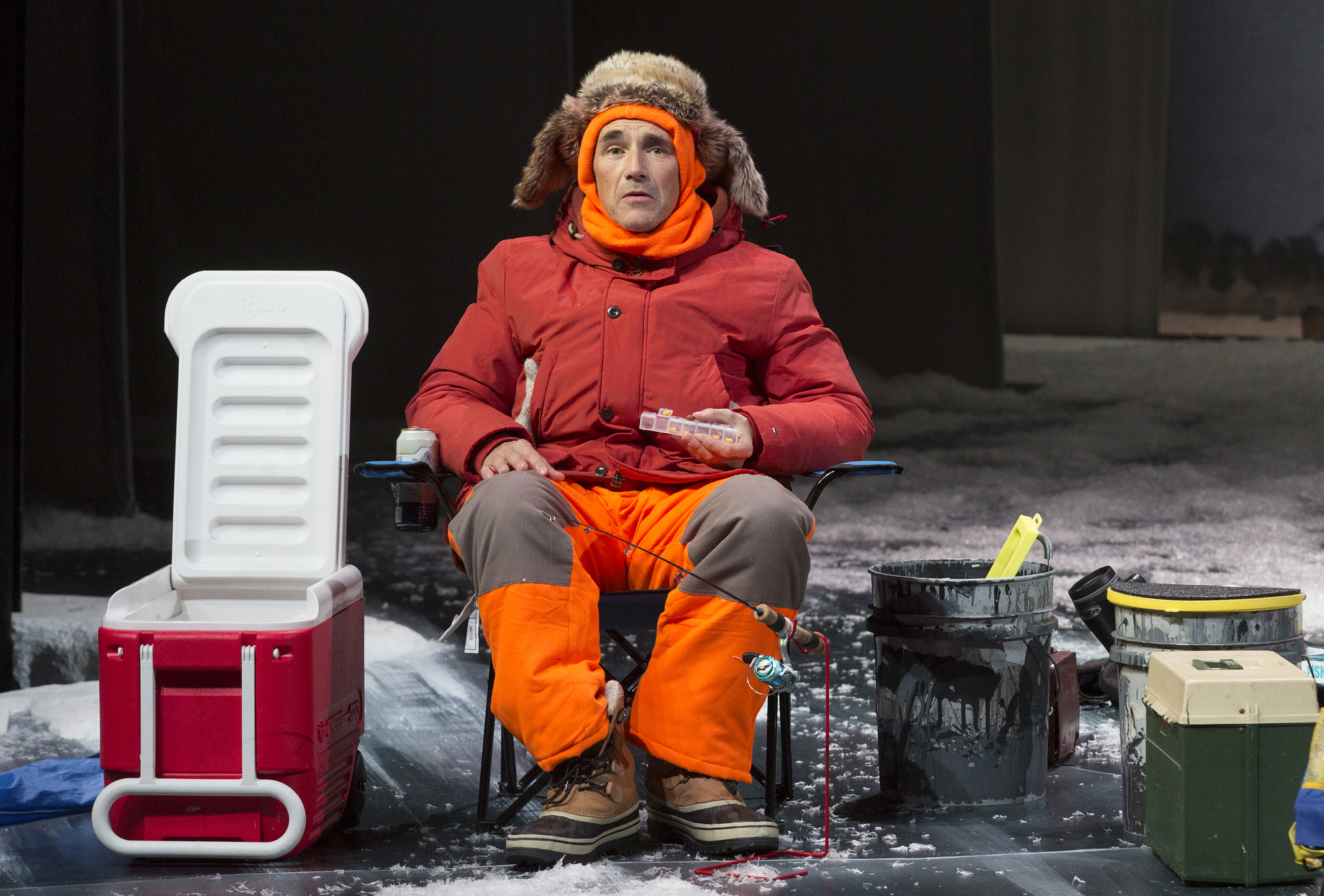 fishThis is not your typical play, and not your typical day on a frozen Minnesota lake (where Rylance spent many of his early years and Jenkin’s spent most of his). It begins with the two trying to drill some holes in a very expansive frozen lake, spectacularly created by Todd Rosenthal (lighting design by Japhy Weideman). The lake seems to go on for ever, as we can see small lights and trees in the far off edge of the lake.  Between here and there, there is just snow and ice, and a few ice cabins scattered here and there.  It’s so well created and imagined, that I do feel the cold in the air, and never doubt for a minute that these characters do as well. I actually felt myself worry at moments when one of the characters doesn’t seem dressed for the cold. Snippets of Jenkins’ poetry is spoken as dialogue, by these two, and the three visitors (a magnificent Kayli Carter as Flo, a hilarious Bob Davis as The DNR Man, and a sweet charmer, Jim Lichtscheidl as Erik), with blackouts in-between these non-connecting dots of thought and whimsy. Some of them are hilarious, and some are just unique and fun, while a few fall a little flat on my ear. But only a few. The wind storm, the puppetry, and the steam room are as funny, inventive, and charming as you can imagine.