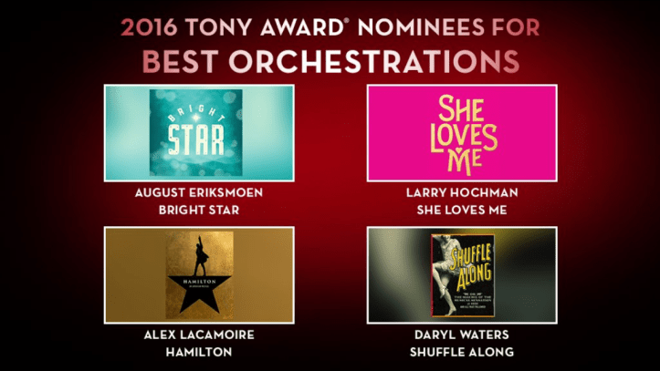 There were a number of surprises, such as the record breaking 16 nominations for Hamilton and the sad few nominations received by Tuck Everlasting, (only one for Gregg Barnes/Costume Design) . Surprised that Waitress only got 4 nominations, but happy for Bright Star that received 5. Not bothered at all that American Psycho only got 2, I didn’t really care for it at all, same with single nominees, Disaster!, Therese Raquin, Hughie, On Your Feet!, Misery, and Dames at Sea. Glad for the strong but small group of great original plays, King Charles III (with 5), Eclipsed and The Humans (with 6), and The Father (with 2). Very pleased for Roundabout’s She Loves Me (with 8) and Noises Off (with 5), and Ivo’s Arthur Miller plays, The Crucible (with 4) and A View from the Bridge (with 5). The revivals of Fiddler… (3), Spring Awakening (3), Long Day’s Journey… (a magnificent 7), The Color Purple (4), and Blackbird (3) should all be quite pleased with themselves, as should the surprise of School of Rock (4) and Shuffle Along… (with a shocking and spectacular 10). Congrats to them all.