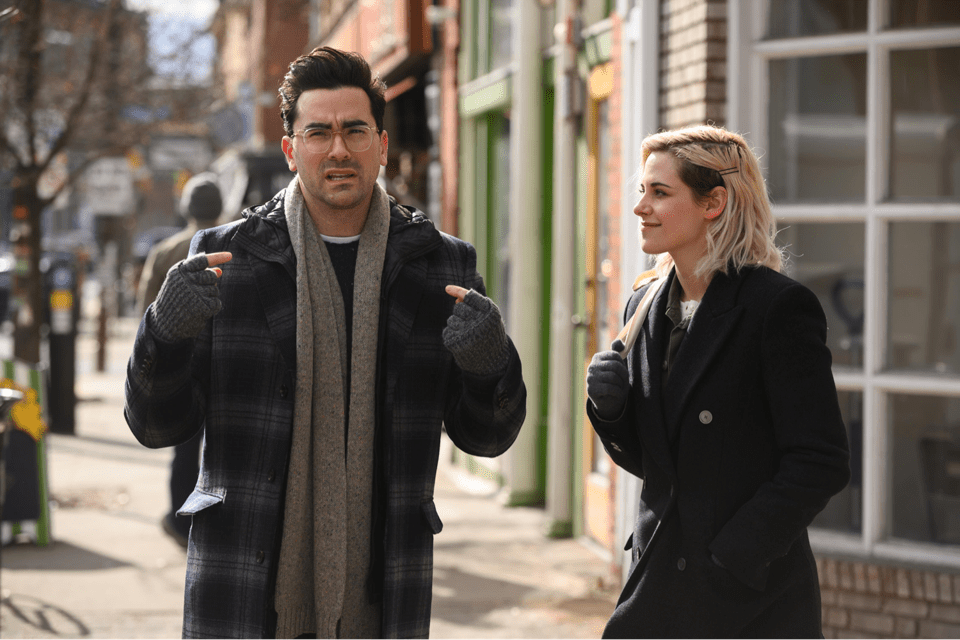 Dan Levy and Kristen Stewart in a scene from Happiest Season.