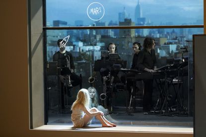 The layers are purposeful, with a clear concept, but where does it lead us to in the end. Designed by the evocative Jan Versweyveld (Park Avenue Armory’s The Damned) alongside video designer Tal Yarden (National/Broadway’s Network), the logical narrative disintegrates into the ultra-chic and depressive void of the space alien. Thomas guzzles down alcohol in the minimalist studio like he’s drinking water, while violence and foreboding tension ricochets across the large monitor and paints the back clear wall with pain and anger. A man named Valentine, played demonically by the mesmerizing Michael Esper, looks with a hunger to be surrounded by love, while psychotically wanting to destroy it with a psychotic passion. The ‘Girl’ seems to be somehow connected to this murderous ploy, but the lines that are taped to the ground never take off into a universe of comprehension. Do we need to fully understand the motivation of Elly’s transformational desire or the murdered Girl’s haunting? Well, probably not entirely. The dreamy fearful tale slips beyond our grasp, but is still quite beautiful to behold, especially when Hall gives us a heartbroken “Hereos” to admire and breath in. Even the most casual of admirers of Bowie will be blown away into a fan-based orbit, embracing the poetry and the ingenuity of this iconic, but confounding genius, especially when enveloped by the vocals of Hall.