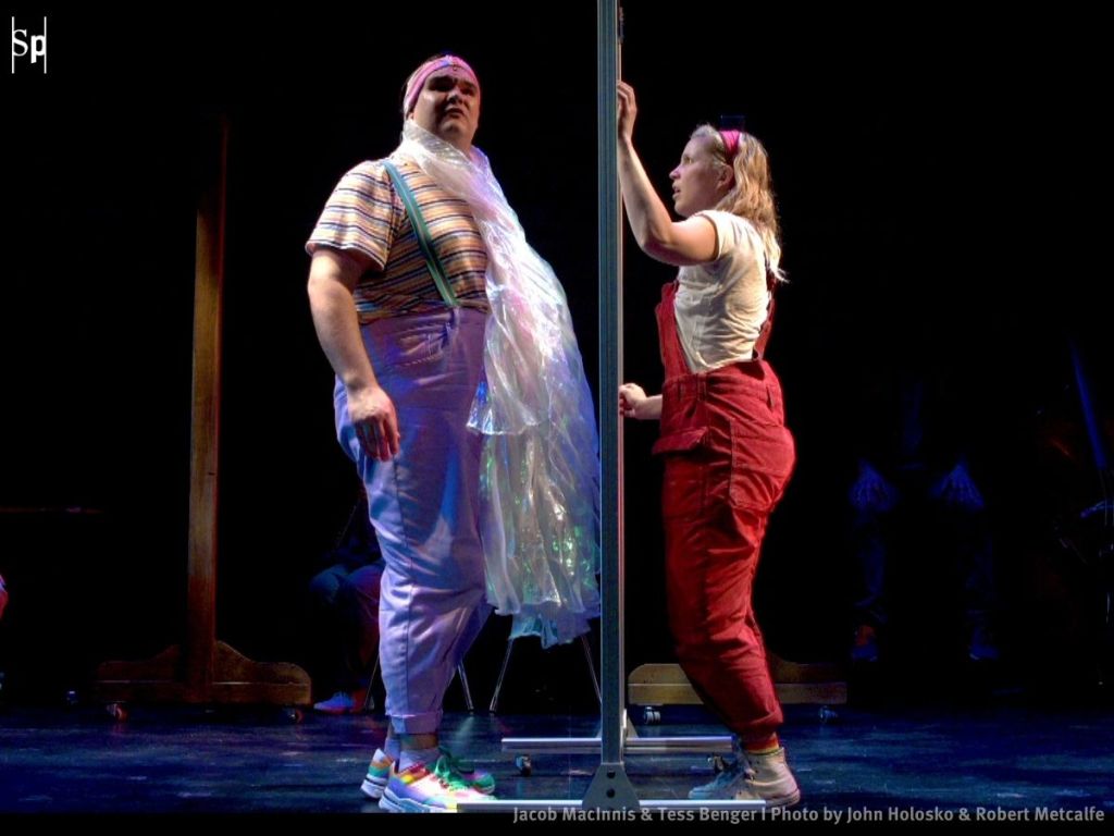 Following the rightness of the rabbit, Alice stubbles upon one iconic character after another, each one played with an inventiveness that will leave the kids wanting more. Adaptor Sauder and writer Doak give us a Tweedle Dee and Tweedle Dum that magnificently ring with pleasure and perfect comic timing, spinning that chalkboard with glee. Decked out in perfection by costume designer Ming Wong’s (Canadian Opera’s Hansel und Gretel) inventive layerings, they, along with all the others, like Phoebe Hu’s Rose, Duck, & Unicorn; Richard Lam’s Douggie, Dodo, & Lily; Jonathan Tan’s Cheshire Cat; and Jacob MacInnis’ Maddie, Owl, Buttercup, Bill, and the ever so gentle Caterpillar, drive the exquisite experiment along with energy and delight, adding layers of engagement and potentiality to every hop and squared jump.