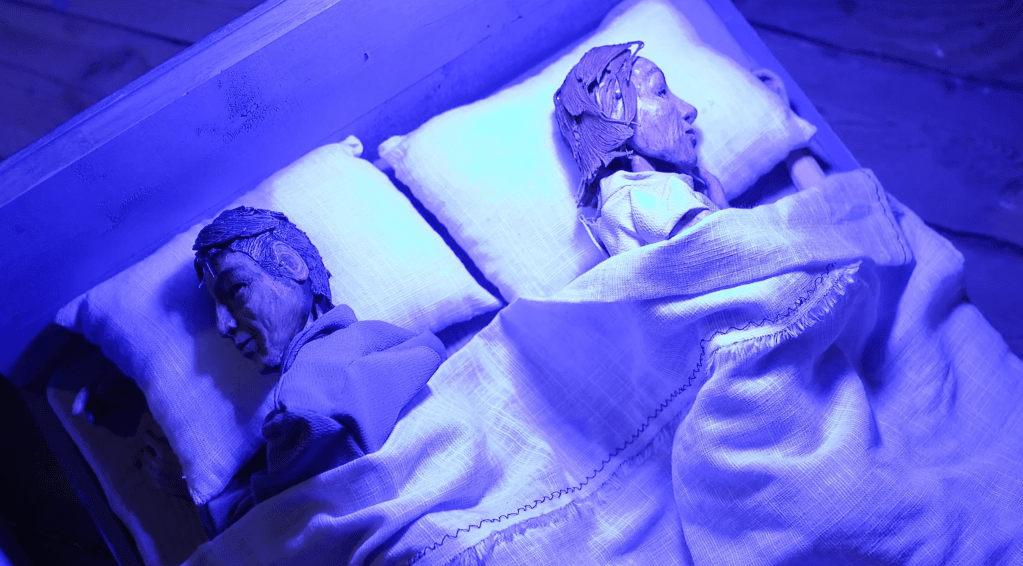 Observing all of the strict COVID-19 protocols that a controlled environment can facilitate, a strong group of artists in September 2020, pulled together by Ma-Yi, assembled in a barn in Wisconsin with these cocooned wooden creations in order to find a way to emotionally create an inventive and meaningful puppet play staging. The result of this collaborative experiment is Vancouver, an impressively touching story centered, most intimately, on a mixed-race family struggling intensely and internally with the anti-Asian hate that has been ignited within current America. Violence and intolerance is thrown in this family’s face, quite literally, after relocating from Japan to the Pacific Northwest. They came with the hope of finding more stability within themselves and their community, only to face further heightened tensions and conflicts inside and out. Clashing hard inside every moment of interaction, the dashed hopes of acceptance and peace give way to utter disconnection and dissatisfaction. It’s a lot to take in and process, all that intense anger being lashed out at one another, with the larger more personal questions remaining fully intact. Swirling around their very existence, they ask one another: Where is the loyalty, the love, and the idea of home at the end of the day when darkness brings isolation, drunkenness, and unrelenting disappointment? And will they find the connections within to survive and thrive together?