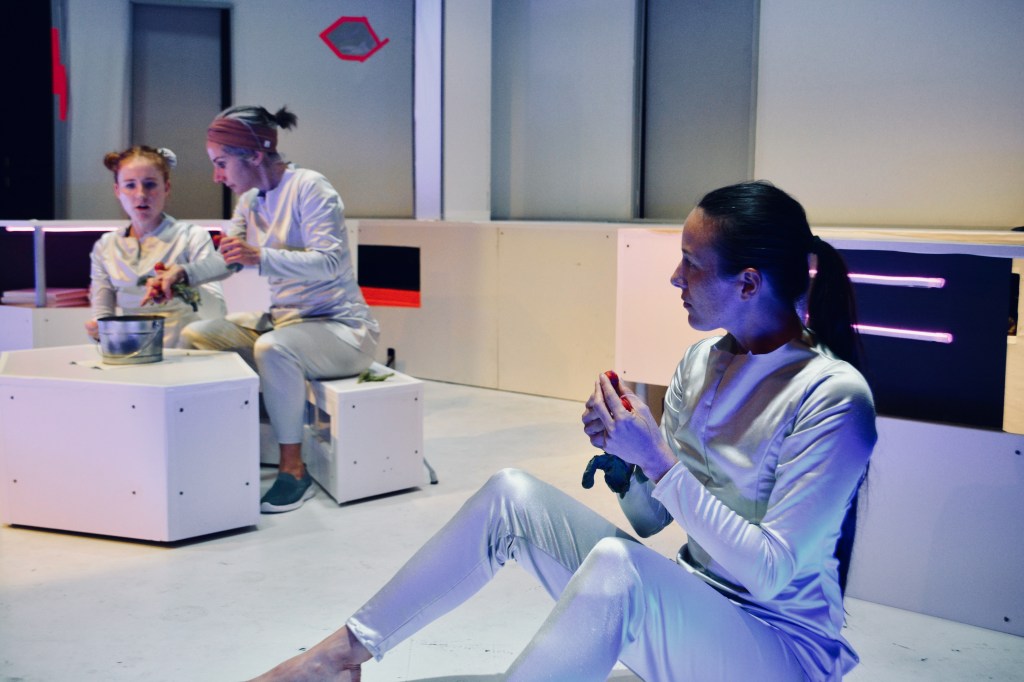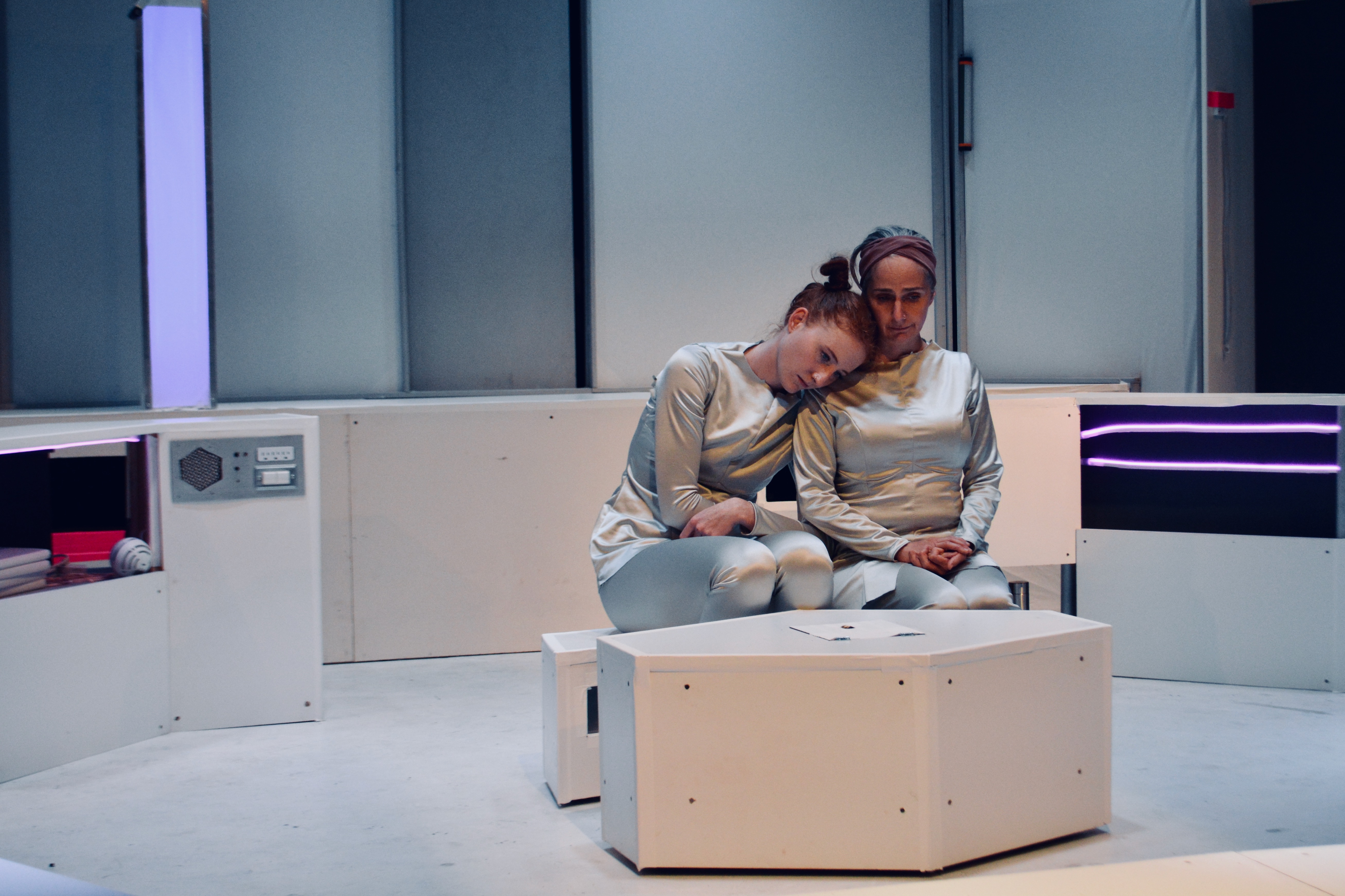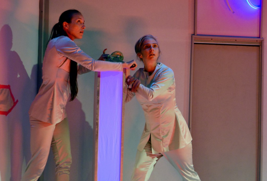 Alma and Baya are quite the pair. They could be opposing internal forces within our inner consciousness, or they could truly be what they say, a working pair, programed differently to act out a regime that will keep them alive and well. They wake, eat, follow the rules, turn cranks when instructed, and pleasure themselves when the time allows (how? I’m not sure, but I’m intrigued). They live out their days together, side by side, although not even in power or dynamic, on a seemingly hostile planet inside a neutral white pod. It has been designed to sustain them, through volumes of rules and instructions, until some sort of conclusion or outcome presents itself. It’s a compelling premise, bathed in symbols and metaphors, and underneath that intricate set designed with a clarity of vison by Mike Mroch (The Brick’s Unsex Me Here: The Tragedy of Macbeth), enhanced with lighting by Federico Restrepo (Don Quixote Takes New York at La MaMa), perfectly formatted costumes by Ramona Ponce (Red Bull Theater’s The Mystery of Irma Vep), strong Fight Choreography by their Baya, JaneAnne Halter, and a precise sound design by Mark Bruckner (The God Projekt at La MaMa), a number of questions floats magically in the air. Where exactly are we and how did we get here? Is this a working brain in conflict, a post-apocalyptic earth scenario, or somewhere/something else entirely? And what had to happen to bring them and us to this white bright place and time?