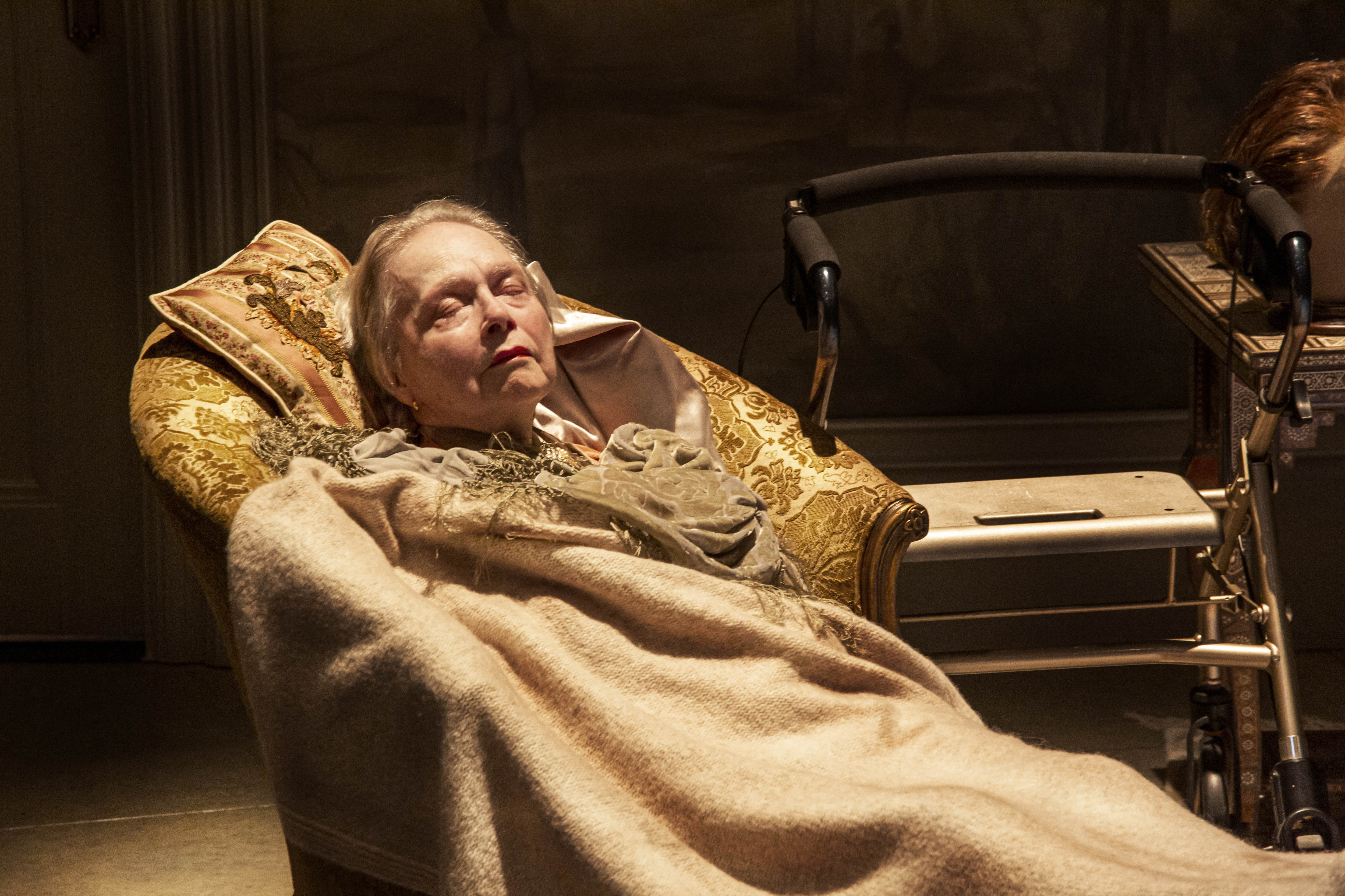 Henry’s A asks to be helped into bed, and in the middle of a sentence things start to warp into something quite different, and in the aftermath, we see just how powerful Henry, the actress, truly is.  Through the second act window, this old woman, divided into three, delivers the joy and optimism of her childhood and her early marriage, before being forced to face up to the painful events that caused her anger and regret, namely her husband’s affairs and death, and the estrangement of her gay son. It is here, within the second part of the play when the complex and compelling construct truly is given the full opportunity to shine out from the darkness with fearless rage, optimism, and the stench of death close by. The three embodied layers are almost Shakespearian in their tragedy, finding energy and excitement inside their disbelief and rage. Zwettler finally is given the chance to unpack her true connectivity while swirling around in a beautifully designed dress. She, and that dress, radiate all that lives and breathes inside a privileged 26-year-old woman who sees only good things coming towards her from all angles.