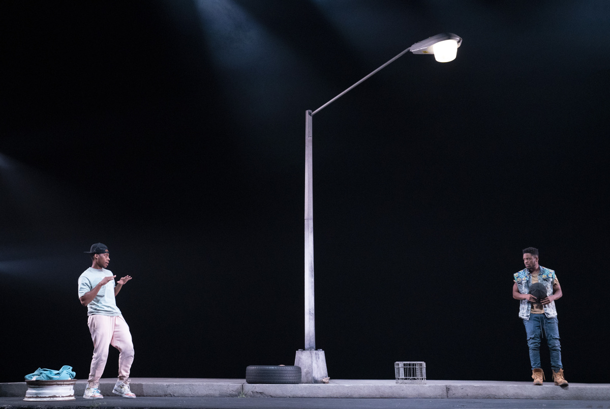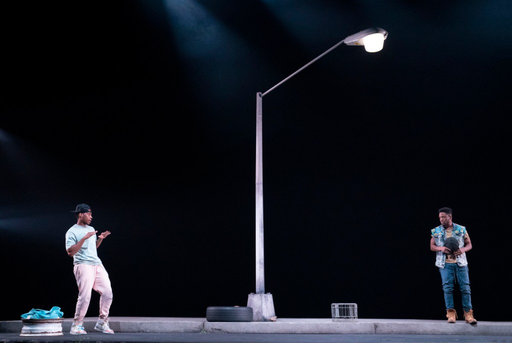 It’s an combination of forces, part Samuel Beckett existentialism, part Exodus, with a large protesting edge centered around the ideals of Black Lives Matter movement and the heightened awareness of racial profiling and police brutality, all layered on the strong shoulders of two young Black men stranded on a street corner dreaming of passing over to a safer land and a better future. Pass Over, the play, swings large yet small, with subtle gestures of abstractionism and intense internalized meaning, played out authentically and symbolically by the two central characters named Moses and Kitch in both language and movement. Their banter and jabs resonate, all under a streetlamp positioned in just a way that I couldn’t help but register as a dangerous tree branch in the South. The two are stuck, much like the characters in Waiting For Godot, engaged in an endless dialogue of captivating play and sudden assumed positions of terror that pull us into their orbit, whether we understand the conceptualizations or not.