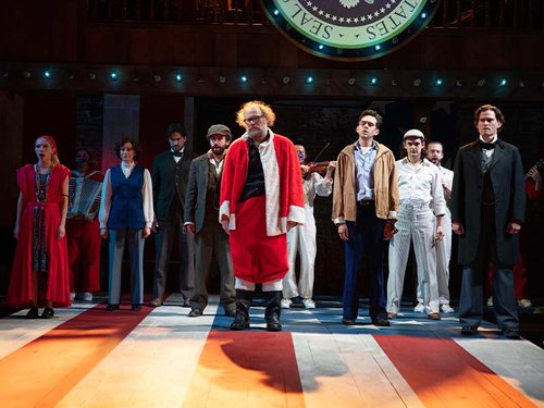 Assassins is quite the macabre framework for a somehow absolutely delightful musical. I’m sure it’s not for everyone’s taste, but for this theatre junkie, especially during his Sondheim Week of Appreciation in NYC 2021, it is pure theatrical magic; hilarious, entertaining, and wildly intellectually fascinating, especially in this small electrifying revival currently taking aim under the watchful and artistic eye of director John Doyle (CSC’s Pacific Overtures; The Cradle Will Rock). The man is no newbie to Sondheim, finding simplicity and honesty, alongside artistic majesty inside each of his Broadway productions of Sweeney Todd and Company. Some say he keeps playing with the same deck of cards, but I beg to differ. I walked into that perfectly aligned space, designed simply and strongly by Doyle, ready and willing to watch him reload and fire something fantastic our way. And it wasn’t formulaic, but exact and forever interesting.