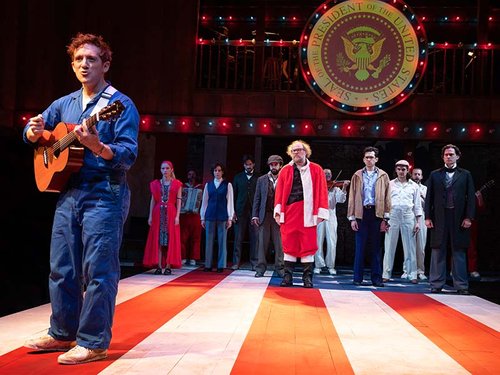 Then there is Andy Grotelueschen (Broadway’s Tootsie) as the Santa Clause suit-wearing Samuel Byck, who states with a wild abandonment, “All I want for Christmas is my Constitutional right!” He drives like a maniac, never getting himself close to the act of hijacking a plane and flying it into the White House, in a failed attempt to kill President Nixon. But Grotelueschen does the complete opposite of failing here in his hilarious car ride scene to the airport.  He isn’t given a musical moment to really shine, but his monologue is high-wired memorable and utterly captivating.