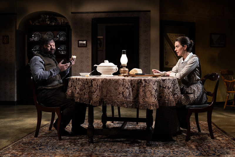 In 2003, the Mint Theater Company brought The Daughter-in-Law, a forgotten old play over to NYC for what turned out to be an acclaimed run. Mint has that nack, of pulling out of the abyss long-neglected plays in need of revival. Sometimes it doesn’t always work, but other times, more often than not, it really does, and with this play that was written in 1912 by novelist D.H. Lawrence, one year before the 1913 publication of his novel, Sons and Lovers, the triumph was real (although I’m only going by what I’m reading, as I didn’t see it myself. Back in the day, this play sat unproduced and unpublished until 1967 when it was resurrected at London’s Royal Court, and revived once again at The Young Vic in 2002. At the time of that second revival, The Guardian newspaper called it “one of the great British dramas of the 20th century.” So it was with no surprise that the Mint saw some glory in its stateside 2003 revival and then some additional glory in reviving it once again at New York City Center Stage II, giving us all one more chance to be invited into that small English cottage that we see upon entering the theatre.