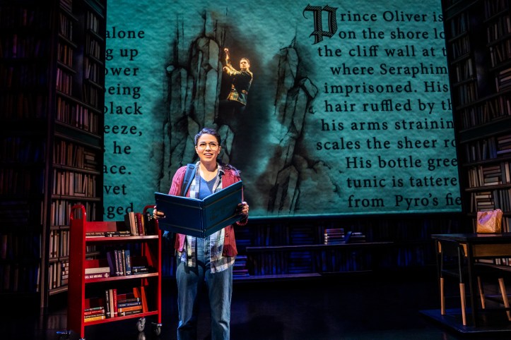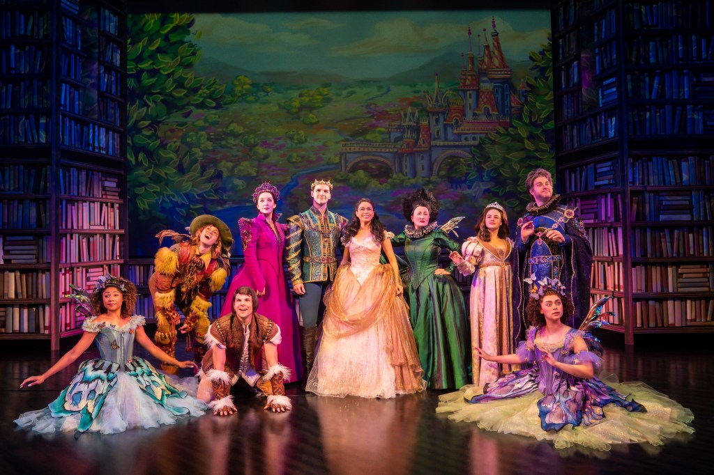 The ingenious set, designed creatively by Tobin Ost (Broadway’s Newsies), with strong lighting by Jason Lyons (Broadway’s Hand to God), a clear sound design by Ken Travis (Broadway’s Memphis), and a wonderfully intricate projection design by Caite Hevner (Broadway’s In Transit), adds layers of book-smart fun to the production with panels from the stage floor flipping and angling their way up, or pages from a book unfolding and transforming themselves into secondary uses, much like the cast. Overall, the cast does an exemplary solid job giving life and joy to both worlds, especially in the way they unpack the upside downs of all the characters, and I don’t mean that in the scary “Stranger Things” kinda way. But, we must admit (without shame) that this fun fairytale musical is no Into the Woods. At least not yet.