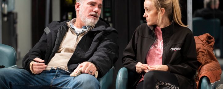 Shortly after Reggie’s arrival, sliding into a seat at the far end, and systematically burying his face underneath his jacket is another one waiting for treatment. It’s hard to get a gauge of who this man is, as he seems as separate and distant as one could possibly be. If that chair could have been moved further away from the examining room, he would have. But Toby, played heroically by Patrick Vaill (St. Ann’s/Broadway’s Oklahoma!) does his best to disconnect, only starting to engage with the others when they start to find the space to talk and he can’t hold back. His brooding energy is intensely forgiving, especially when we get a glimpse of the woman, his mother, played terrifically by Laura Esterman (TNG’s Good for Otto) swinging her, and her singing pots into the seat beside him. She is exactly the last person I would want by my side in a cancer clinic waiting room, suggesting quite revoltingly, that he might be the one responsible for his cancer. Yet this is all he has, and we feel for him, especially when the engagement starts to fly off into a holistic debate.