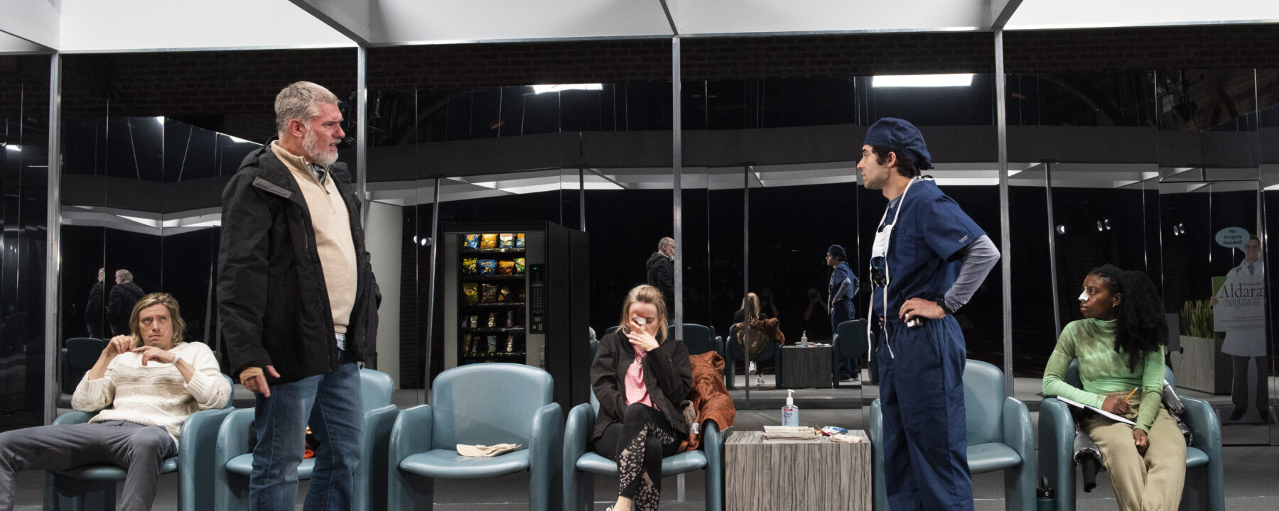 The couple that arrives soon after, sitting down in between these two patients, turns out to be the one that takes this darkly funny, dark play to a whole other level. The tense brittleness is clear from the moment the reluctant Jordan, deftly portrayed by Glenn Fitzgerald (NYTW’s Othello), and his wife, Liane, played engagingly by Emily Cass McDonnell (PH’s The Thin Place), arrive, but it isn’t until the later half of this ninety-minute one-act play when the revolting unhappiness is on full display. It’s a hard task to take in, what happens between the two, but we see and feel the friction immediately, as the last to arrive in the room sits himself down. He is the captivating veteran patient of the clinic, Clyde, played strongly, even with the script in his hands, by Peter Maloney (ATC’s On The Shore of the Wide World), standing in for Peter Gerety. “He’s not going to like your vibe,” Chevannes’s veteran doctor states to the young resident Jonathan, played beautifully by the very good Bartley Booz (Park Ave Armory’s Oresteia), but those fireworks are not as noticeable or as relevant to what happens between these patients and their partners when the doctors are away. Clyde’s place at the proverbial waiting table is essential medicine, stating the obvious as the others whirl around the dynamic.