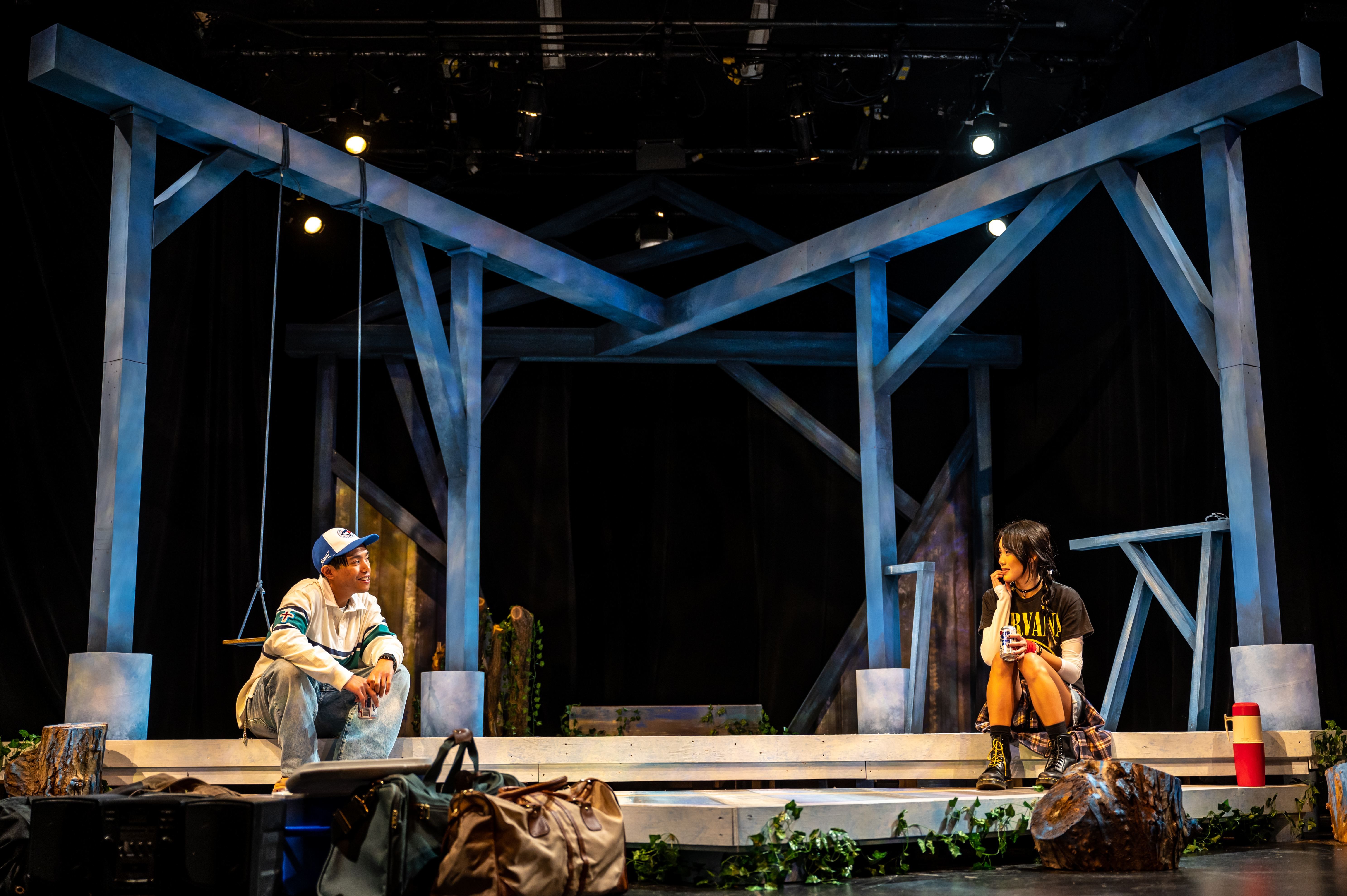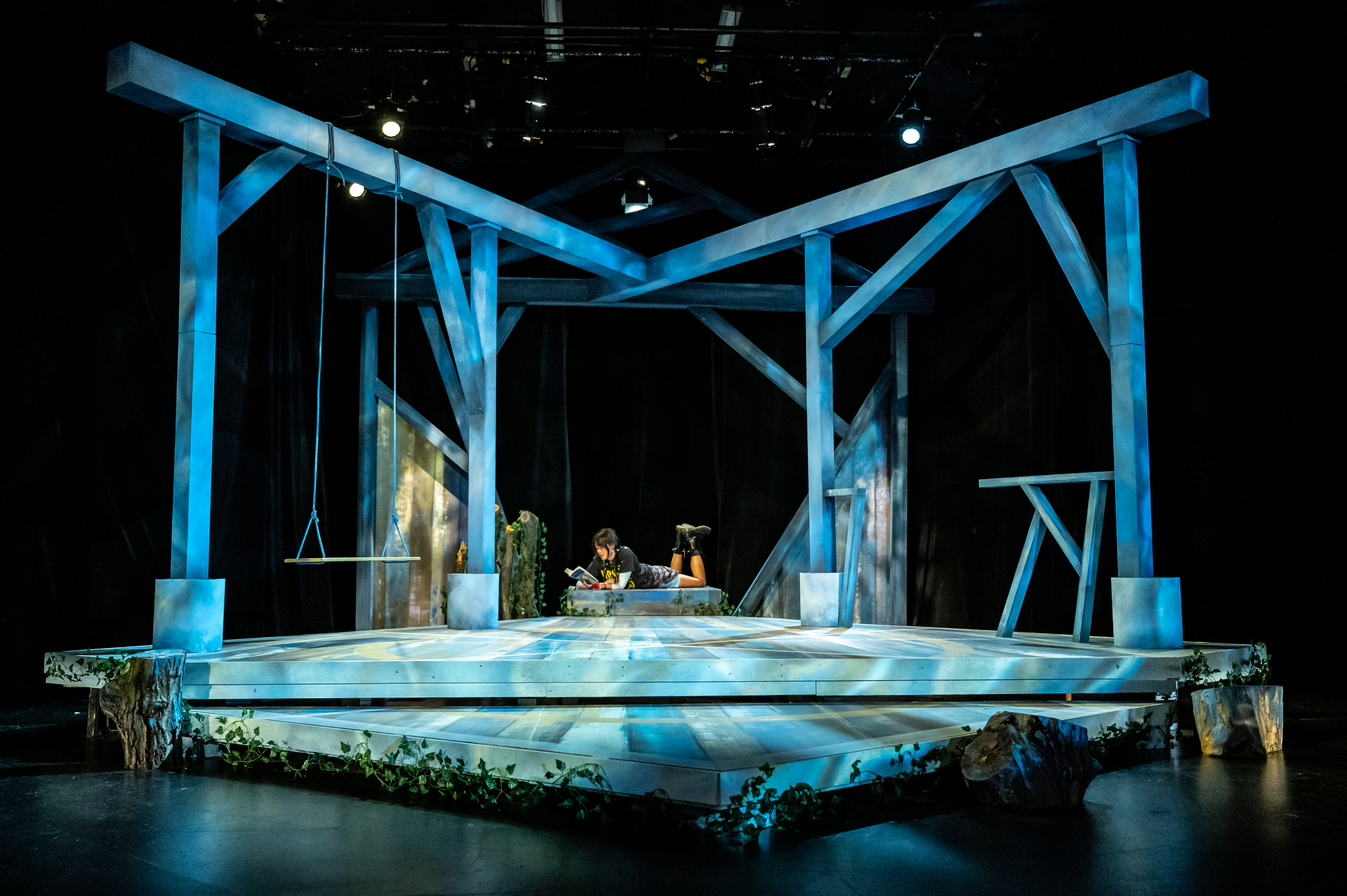 The wooden deck structure juts out at us almost aggressively, but there is a warmth to the setting that feels like nature with a sprinkle of welcoming. There are bottles, or maybe jars are the best way to describe them, filled with blue water and some very specific items placed around the central platform. It’s unclear what they represent (even when the play is over after a quick 70 minutes) but the whole image sets a tone that is convincing and inviting as Factory Theatre‘s fantastically charming new play, The Waltz, gets underway. There is a woman hanging out on stage since we walked into the theatre, reading and reclining. But her tranquility is upended when the theatre lights begin to dim with the noise and clammer of a car door slamming somewhere behind us. Out of nowhere, down the aisle, a young man comes, carrying far too many items in his overworked hands. His arrival breaks that sweet stillness, opening up the dance floor with his energy and his presence.