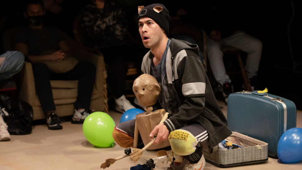 Using paper mache puppetry and a manic makeshift playground energy, Wolf Play delivers forth something special, akin to a scary place for an abandoned young wolf pup to be thrust into, without any intention to cause us fear. On a set that is a playground of sorts made for unpacking, designed with an inventive spirit by You-Shin Chen (AFO’s Monsoon Season), with lighting by Barbara Samuels (PR’s The Rape of…) and sound by Kate Marvin (PH’ Wives), a young Korean child, embodied by a magnificently handled puppet, designed by Amanda Villalobos (MCC’s Space Dogs), but voiced by Winter, is off-the-record adopted. He is handed off, like a Facebook Marketplace purchase, from one overwhelmed family, represented by the complicated guilt-ridden father, Peter, played wisely and with deliberation by Christopher Bannow (Broadway’s Oklahoma!), to another, centered on one half of a lesbian couple, Robin, portrayed impressively by Nicole Villamil (LCT3’s Queens). Robin frets and is, most naturally, utterly anxious about what she has done, how it will affect, and how it will all play out. She knows that this is not how it is usually done; adoption, but it is clear she wants this child, and equally wants to be a good mother as we watch her overinflate balloons and bicker endlessly with her hyped-up brother, Ryan, played with complicated fire by a very good Brian Quijada (Public’s Oedipus El Rey).