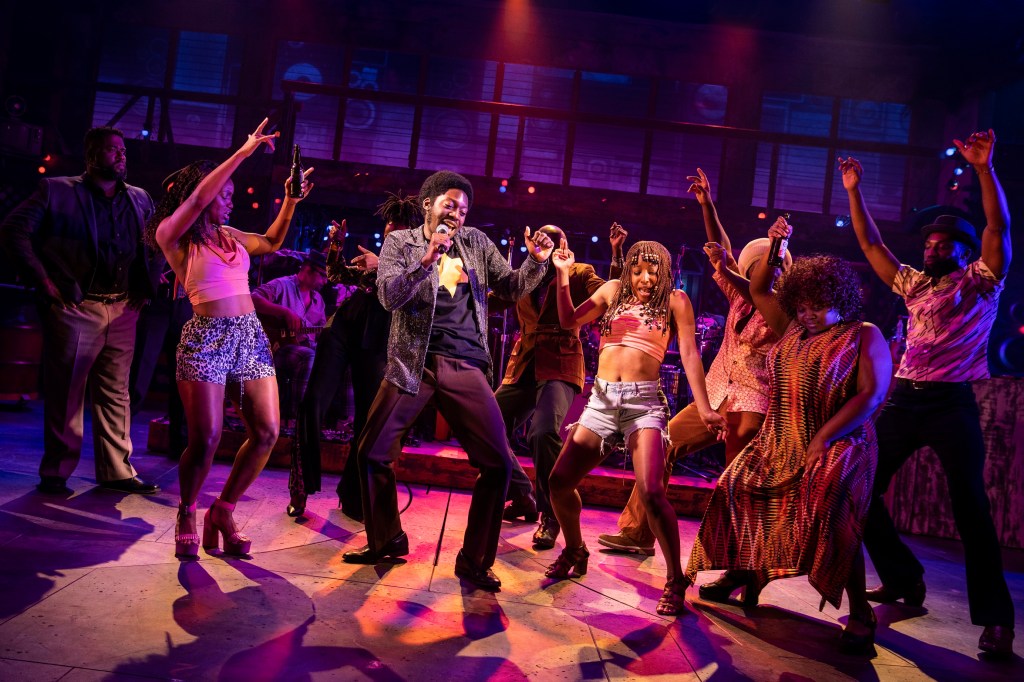 Natey Jones (center) and the company of the world premiere musical The Harder They Come, with book and additional new songs by Suzan-Lori Parks, songs by Jimmy Cliff, co-direction by Sergio Trujillo, and direction by Tony Taccone, at The Public Theater until April 9, 2023. For tickets and information, click here. Photo credit: Joan Marcus.