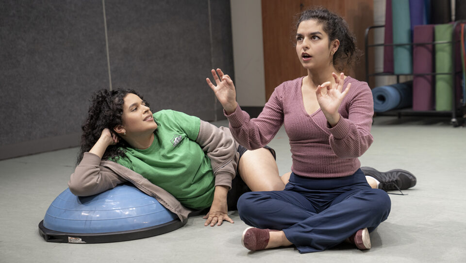 Co-directed with intensity under a hoodie cloak of casualness by the team of Rachel Chavkin (Broadway’s Hadestown), the playwright Padilla, and Steph Paul (LCT’s Becky Nurse of Salem), the engagement begins with two young women trying to understand where they are in their worlds, and how to move forward. The “fiction of safety” is what is being unpacked in their intimate interaction, navigating social acceptance and sexual attraction, within the constructs of the same sorority as this unseen student who was assaulted. Personal attraction and sexual liberation find a quiet sense of space and union with the two, played beautifully by Gabriela Ortega (B Street’s Dance Nation), and Ariana Mahallati (Pixar’s “Win or Lose“), as the duo named Diana and Mojdeh. Diana’s dynamic bravado and Nikki’s complex insecurity shift and float out in a way that is linked to the meticulous language they are given by the playwright. It resonates, both emotionally, and authentically, leading them to an earthy place to shed their baggage, while also connecting in a way that is both funny and endearing.