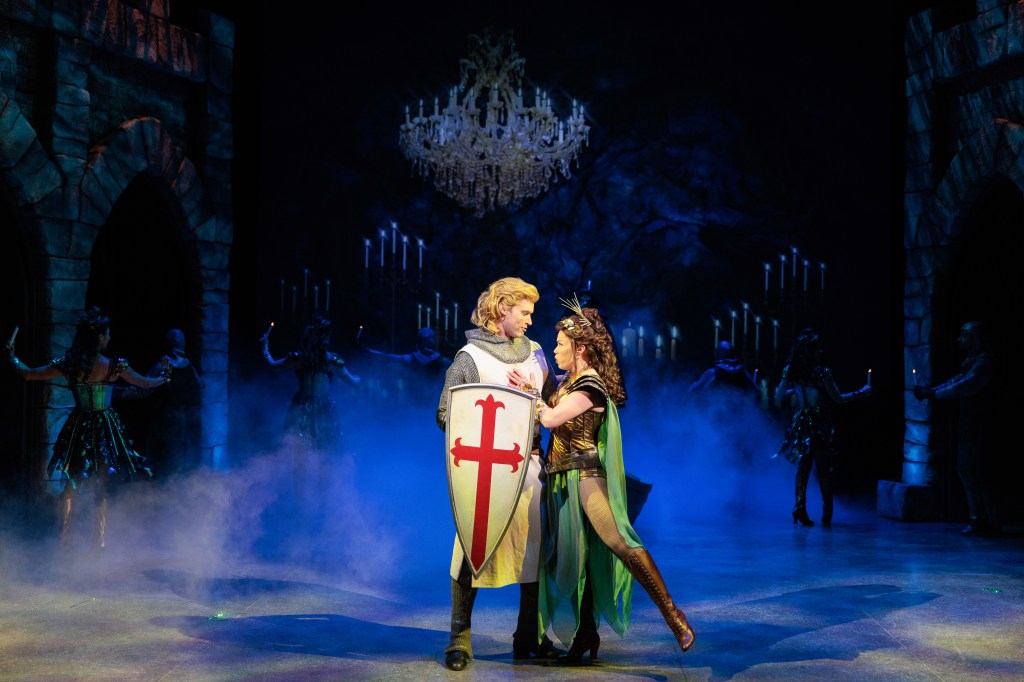 Liam Tobin (left) as Sir Dennis Galahad and Jennifer Rider-Shaw as Lady of the Lake in Monty Python’s Spamalot. Stratford Festival 2023. Photo by David Hou.
