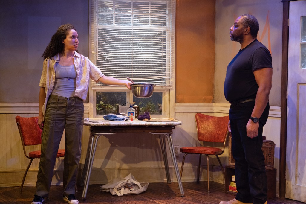 “Bad men don’t come back,” she tells her daughter, who also knows that this is true, but wants to see the bright colors painted, rather than the dirt that still remains visible underneath. These are the scenes that register with more clarity, between mother and daughter, giving the piece a center of hope and care that somehow never enters the other formulation. In that house that has potential, she and her father continue to deconstruct memories of generational trauma, telling sad tall tales that don’t make sense and don’t do the job intended. The way they talk to one another remains forced, pushed to the limit by need, yet breeding tension and feeding the dishonesty of the system learned and repeated. The crowning moment remains just out of reach on the back wall, with doubtful promises of a second and third coat spilling out and thrown about carelessly. The play is a complicated tracking of historical lies and reconstructions, told to soothe and to deceive, but where do we want to place our hope? That’s the complicated question that hangs in the air.