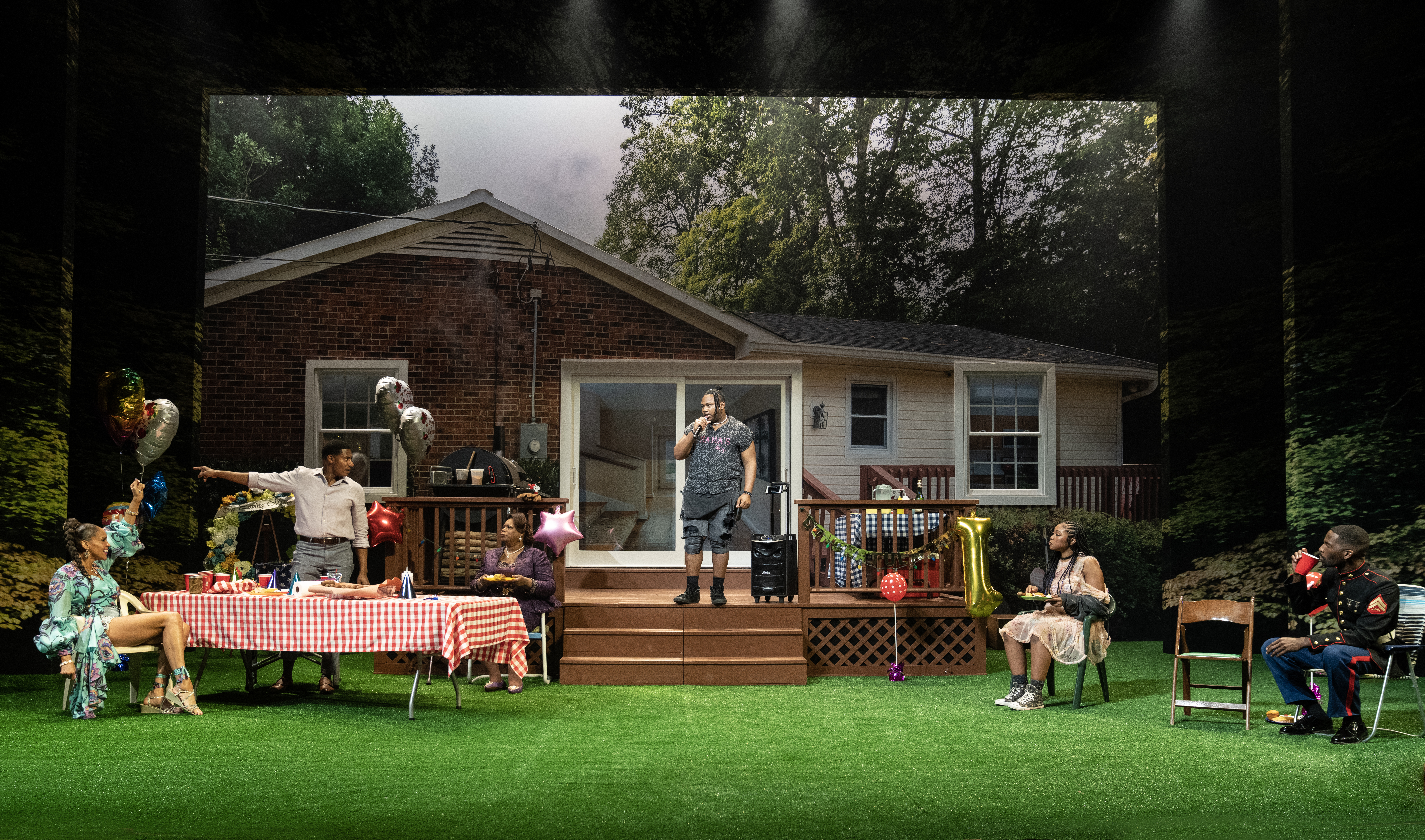 Strongly and intuitively directed with style by Saheem Ali (LCT’s The Rolling Stone), Fat Ham wants to unpack some very modern ideas around toxic masculinity and gender stereotypes, peppered with the life experiences of being a Black queer man who doesn’t and doesn’t always want to live up to the expectations of his paternal role models. As a Juicy Hamlet, Marcel Spears (CSC’s Othello), with a wise wink and an eye-roll, finds himself orchestrating and organizing a backyard BBQ all in order to celebrate his mother’s far-too-quick wedding to his father’s brother, after his problematic father’s untimely death in jail. Juicy isn’t exactly mourning the man who is his father as he hangs up backyard lights to create a festive mood, as Pap wasn’t exactly a good man to the “soft” Juicy. But the idea that his mother, Tedra, portrayed enthusiastically by Nikki Crawford (Woolly Mammoth’s Fairview), has exchanged one bad man for another, his uncle, Rev, brutally portrayed by the wonderful Billy Eugene Jones (Shakespeare in the Park’s Much Ado About Nothing), stings the gentle conflicted soul of Juicy in a way that almost stuffs him into passivity.