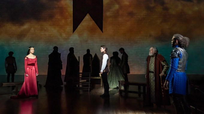 Three black-clad knights take over the Lincoln Center Theatre stage, altering the light, white snowy universe that the space, designed sparingly and heavy handedly by Michael Yeargan (LCT’s Intimate Apparel), first enchanted us as we took our seats at the Vivian Beaumont. These serious knights of Camelot; played by Anthony Michael Lopez (NYTW’s Othello) as Sir Dinadan, Fergie Philippe (MUNY’s Legally Blond) as Sir Sagramore, and Danny Wolohan (Public’s The Low Road) as Sir Lionel, alter the shape of the encounter, giving off an air of strength and serious solidness. And we realize quite quickly that this is not going to be a light and whimsical romp through the legend of Camelot, something I didn’t even know I wanted. Yet, when the once-upon-a-time magical Merlyn, portrayed here by Dakin Matthews (Broadway’s The Iceman Cometh), makes his fatherly entrance as more of a mentor than magician, it becomes crystal clear that the direction of the wind has changed to something more solid, much like those metal walls that keep dropping in from the skies. They send these characters running through a maze of miscalculation, mainly because of the misguided book by Aaron Sorkin (Broadway’s To Kill a Mockingbird), that has somehow demolished the original book by Lerner (On A Clear Day…) with its tone and tension.