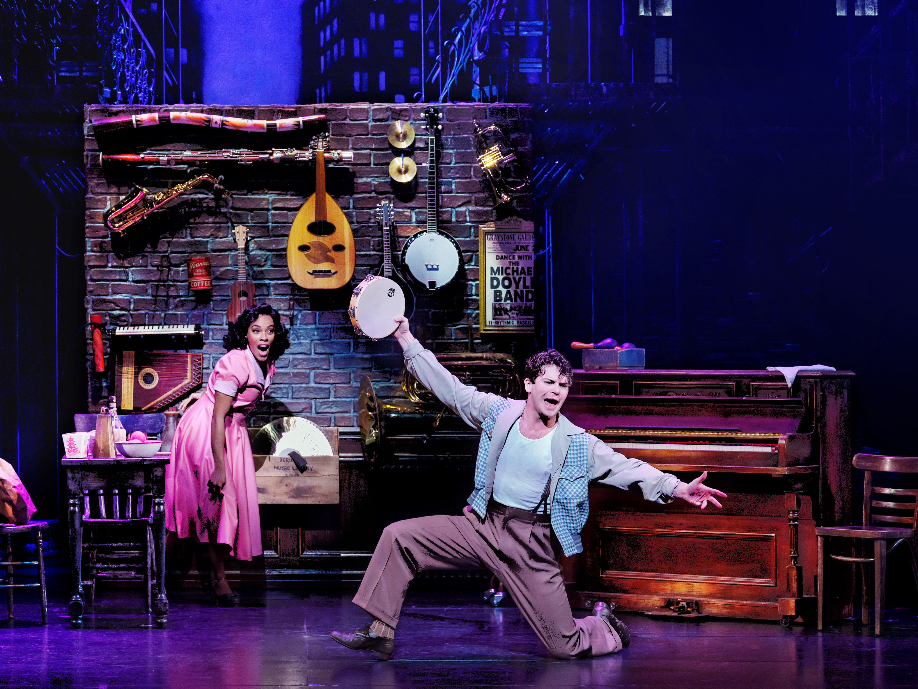Making a thousand faces too many, Colton makes Jimmy into a dangerous clown, which in turn makes their relationship downright disturbing to watch or get behind. Why someone wouldn’t run fast, far away from this damaged and problematic man is beyond me. Their interactions felt consistently emotionally abusive and manipulative almost from the get-go, making it very hard to root for the two leads and their push for their Major Chord success. Uzele is a fine singer and an engaging actor, but I also never found myself fully amazed by her rendition of the two famous songs that this show has at its disposal; “But The World Goes Round” and the title track, “New York, New York.” It’s a huge task, I will give her that, as both have been made uber-famous by the illustrious and astounding vocals of Liza Minelli and her “take 18” cinematic moment. And it’s sad to say that I couldn’t help but contrast and compare, with Uzele, unfortunately, coming out at the short end of that stick. Maybe if I was more behind her character and the choices she was making, I would have been as amazed by her singing as I was of the elevating of the band for the final number. Probably the most enlivening moment of the whole show.
