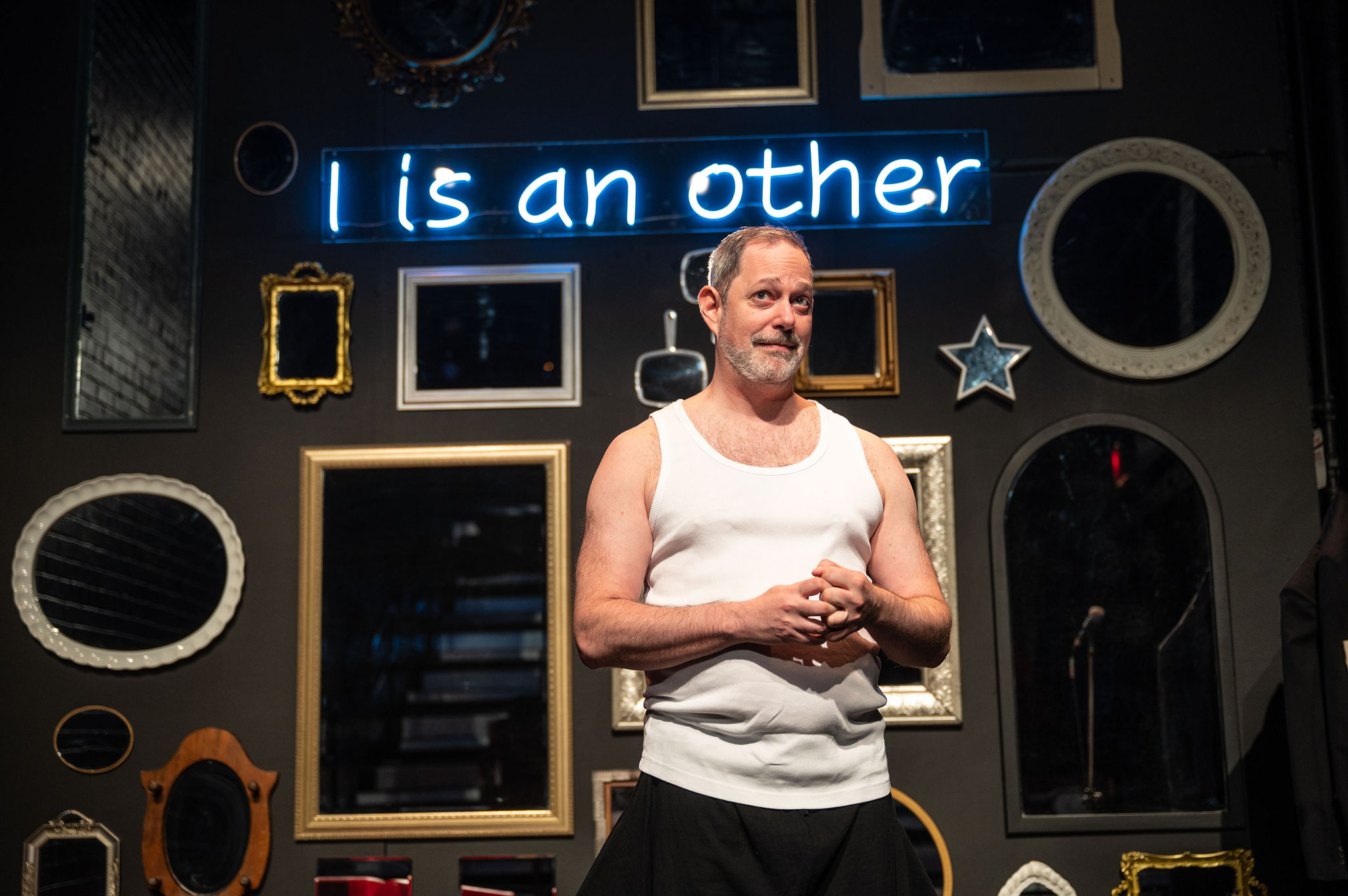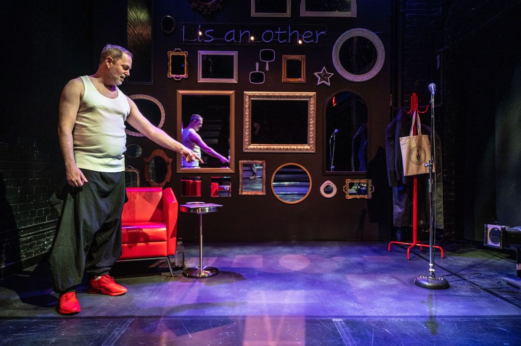 “I is an other,” we are reminded in neon, as the one-man show starts off casually, with Matthew Romantini (Ghostlight’s The Boys in the Band) entering and speaking directly to us. He’s going to tell us a tale, a narrative, that mixes reality and fiction. He isn’t the person standing before us, at least not for the majority of the monologue that isn’t one. He, the actor, is about to transform himself into Sergio, the playwright who is going to, inside his compelling and sometimes difficult text, weave an autofiction around one particular terrifying and disturbing week in Toronto. Sergio, the character who may (or most likely is not) be the same who wrote the script, has arrived at his hotel so that he can give a lecture later that week at the University, all around the idea of Narcissus and the artist. He’s quite a proud creature, rattling off his intellectual successes, well, like a narcissist treating us to a long list of his grand accomplishments. It’s somewhat distancing, yet it is a blurring of self and the other, and once Romantini finally unzips himself and slips into the reflective pool of Sergio, he digs in and meanders around a formulation that is part autobiography and some pretty forceful and harrowing fiction. It’s Greek mythology with blood stains, and a whole lot of graphic sex tales to either engage or distract. Depending on your tolerance.