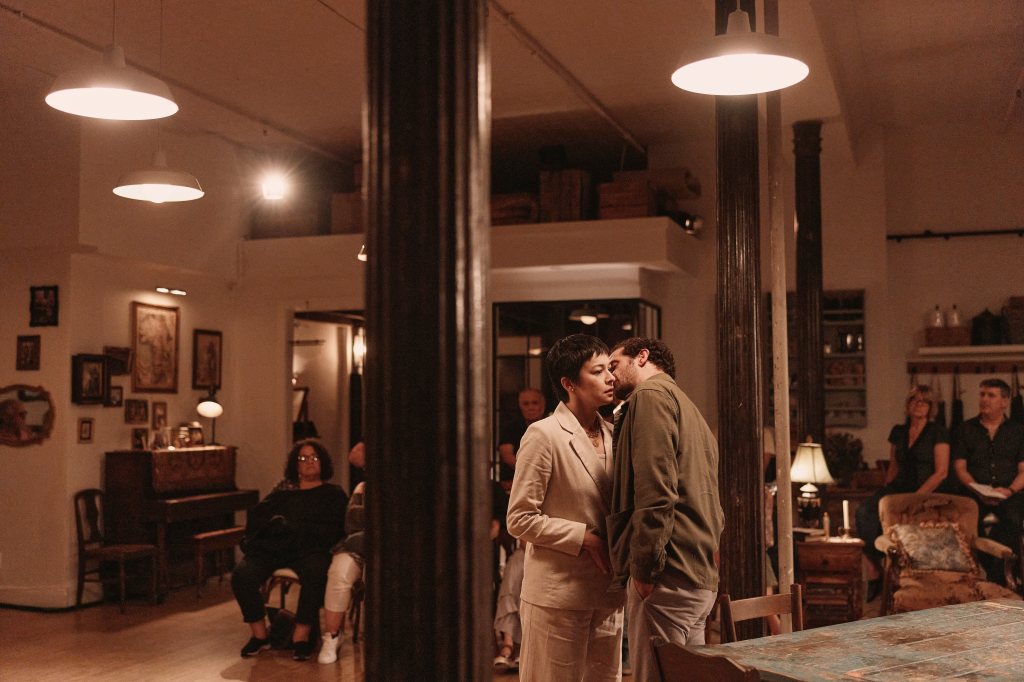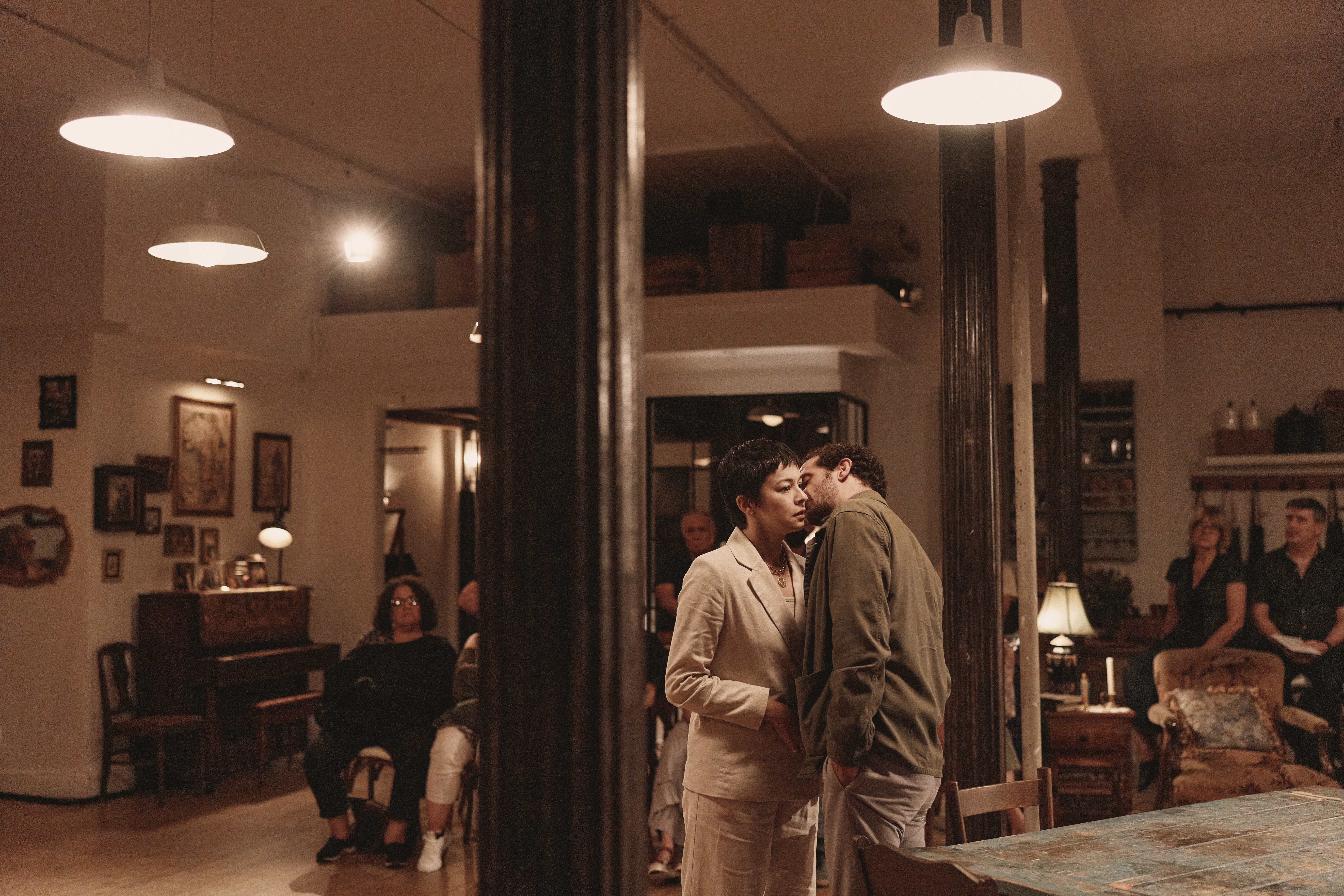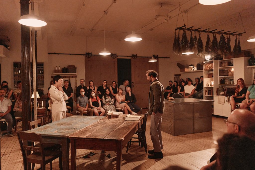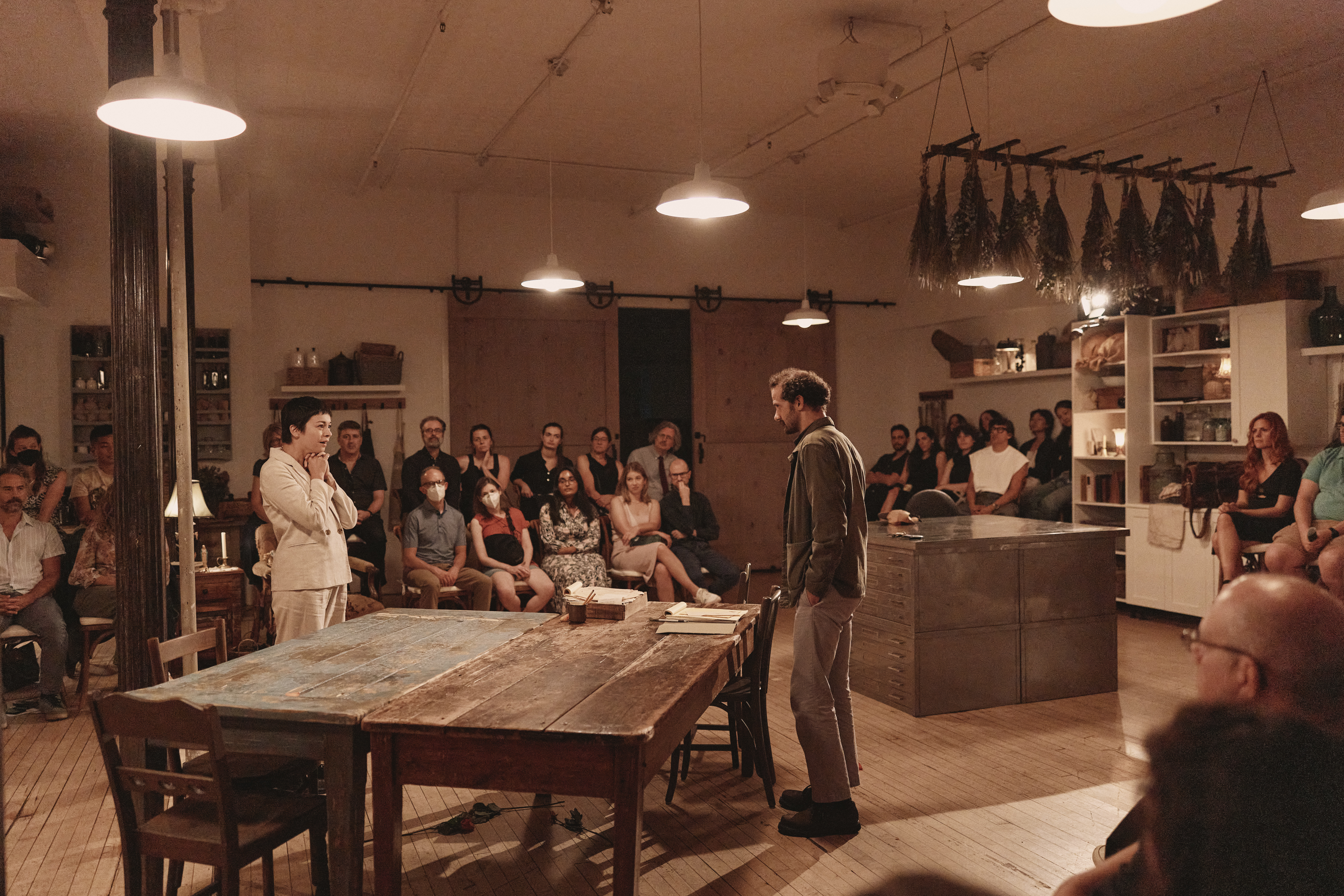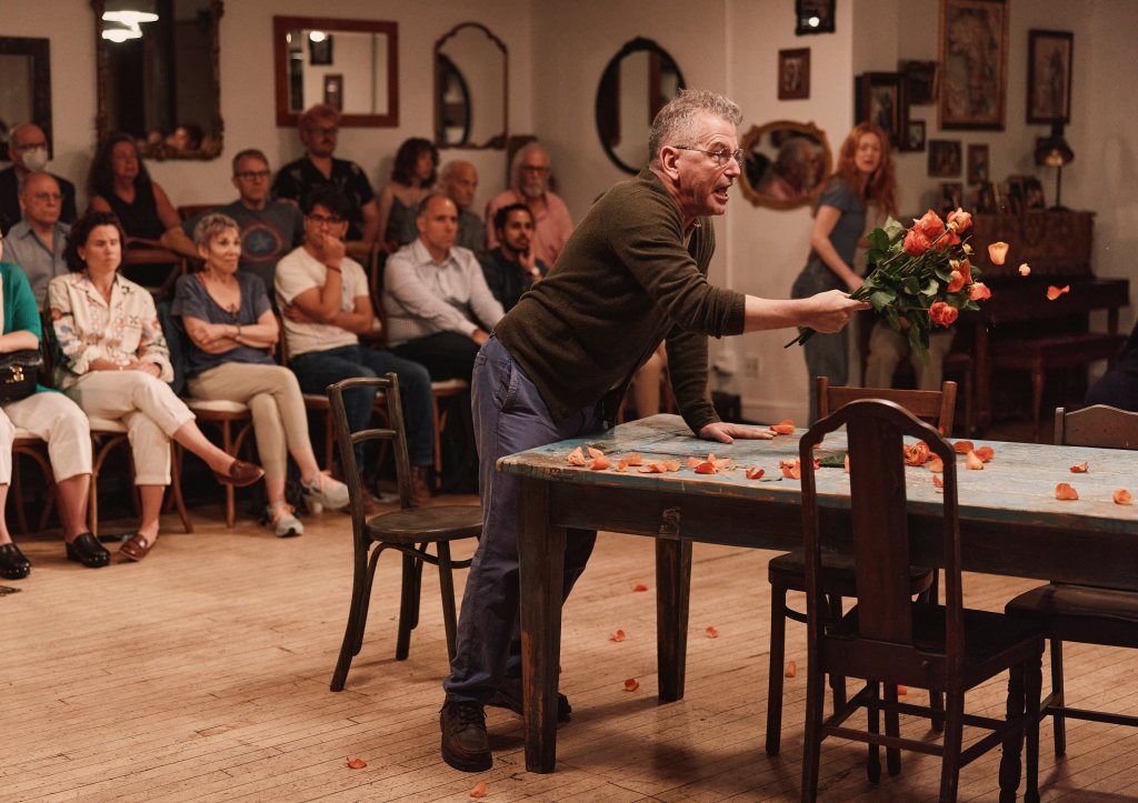 The heat and humidity of New York City settle onto my skin like a heavy coat made of despair as I make my way up to the fourth floor of that downtown loft where OHenry Productions‘ dynamic and intimate Uncle Vanya is rolling itself out to an audience of 40 lucky souls. With the well-established translation by Paul Schmidt firmly in hand, Chekov’s iconic play expands magnificently, feeling as fresh and modern as ever inside a space that opens itself up to us with wide sad arms and a captivating embrace, even as we fan ourselves determined to stay cool. With a long wooden table taking center stage, surrounded on all sides by the seated few, the rendering gives off a feeling reminiscent of a time and place that I was never fortunate enough to have been around for. The environment, as designed most intricately by Walt Spangler (2ST/Broadway’s Between Riverside and Crazy), with simple but pooling lighting by Stacey Derosier (NYTW’s How To Defend Yourself) and detailed props by Carrie Mossman (Barrow St’s The Effect), captivates a similar air to a scene from one of my favorite films, “Reds” (directed and starring Warren Beaty) where artists, intellectuals, writers, and actors gather together in an earthy beach house by the sea to act out works in progress with their friends and colleagues gathered around as their audience. The downtown Manhattan loft space that we find ourselves in radiates that communal heat, daring us to become part of that community and give ourselves over to the unpacking. Engaged and inspired by the talented artists that surround us, we lean into their proximity, feeling their pain and intense loneliness as they deliciously take the most solid crack at Anton Chekov’s classic piece of art called Uncle Vanya.
