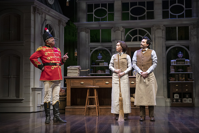 “One false move,” he tells us as the grand setup is laid out beautifully before us, and “we could have a farce!” And boy, do those well-trained moves deliver in this delectable romp as directed with a keen sharp wit by Craig Hall (Shaw’s Faith Healer). Packaged perfectly in its farcical design, Stoppard is giving you a bit of Budapest’s Parfumerie (the 1937 play by Hungarian playwright Miklós László, that the musical She Loves Me and the film “The Shop Around the Corner” and ultimately, “You Got Mail” were all based upon) and a whole heap of secondary storylines from the iconic musical, Hello, Dolly! So it’s no surprise that deja vue abounds, as the connective tissues are all there for the following. Stoppard used, as his base, the 1842 play, “Einen Jux will er sich machen” (He’s Out for a Fling) by Johann Nestroy, a play that Thornton Wilder also based his The Merchant of Yonkers play, and subsequently, the more universally known The Matchmaker. In that reworking (are you still following all this?), Wilder added a character Stoppard and On the Razzle left out; the infamous Dolly Gallagher Levi, who Jerry Herman musicalized into the beloved Hello, Dolly! Stoppard, on the other hand, focused his unique vaudevillian wordsmith charm on the characters that Wilder downgraded to second fiddle. And in that focusing, we all have been gifted with the gloriously funny and sharp as a tack On the Razzle.