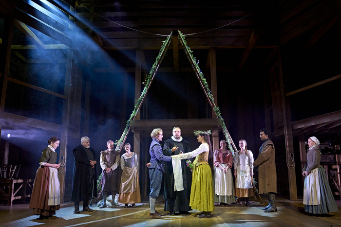 This has little to do with the fine work that is being delivered by a cast determined to engage. Ajani Cabey (“The Fence“) as the lively and sweet Hamnet finds clarity and connection in his caring relationship with his twin sister Judith, wonderfully embodied by Alex Jarrett (NT’s Our Generation). Peter Wight (PPA’s Oresteia) as William’s brutish father, unwraps the difficult glove maker with a determined finesse, finding some sort of humanity underneath the hardened skin, as he also does with the role of the London actor Will Kemp. As Will’s mother, Liza Sadovy (Wyndham’s Oklahoma!) expertly renders a woman who we see slowly beginning to understand the worth of her daughter-in-law, inch by inch, step by step. And Sarah Belcher (Almeida’s Medea), as Agnes’ stepmother, Joan, finds testy power in her unleashed spite that comes fully enmeshed in her cold heart.