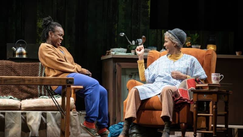 It’s clear that in this wide-open, long, but magical play, the first white figure is that previously mentioned husband who goes by the name of Walking Man, gloriously embodied by Jon Michael Hill (Broadway’s Pass Over). He was killed by a cow, if you can believe it (and you will as he talks us through his demise later on), and now he pays frequent compassionate visits to his wife and the other members of this four-generation clan living under that very small roof. He kisses them with love and care; his daughter, Joy, beautifully portrayed by Ngozi Anyanwu (Vineyard’s Good Grief), his grandson, Ha-Ha, delightfully played by JJ Wynder (HBO Max’s “That Damn Michael Che“), and Walking Man’s difficult and complaining hard mother, Grandma Early, dynamically embodied by the fascinatingly good Nicole Ari Parker (Broadway’s A Streetcar Named Desire; Fox’s “Empire“), the family matriarch and the one, as it turns out, who will be walking us through these woods, back in time, in hopes of finding some meaning and deliverance.