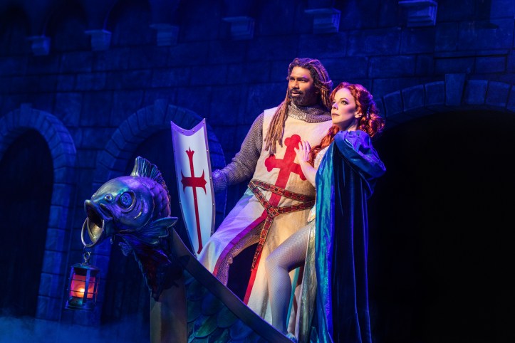 But first, Sir Robin and Sir Lancelot need to navigate past the “Not Dead Fred” (yet again played magnificently by Ethan Slater – the male version of Kritzer in this show, looking pretty gosh darn good in a pair of tighty whities holding a puppet in his right hand) and his lively riotous number, “I Am Not Dead Yet.” Gloriously grand; stunning like a shovel to the head. But it’s Sir Galahad (and his mother) who needs to be convinced by the mighty charms and voice of the ‘Lady of the Lake‘ who has to prove to them that the story of Excalibur is real and true. Pom-pommed on by the “Laker Girls Cheer“, she turns Dennis into the dashingly handsome Sir Galahad and together, they sing the most spectacularly generic (and wonderfully long) Broadway love song, “The Song That Goes Like This“, complete with a dramatic key change and a boat ride in order to win out the day. With a grand fling of his long dreadlocks, he happily joins Sir Robin and Sir Lancelot, and together with cagey Sir Bedevere and the “aptly named” Sir Not-Appearing-In-This-Show (Daniel Beeman), they all set off for Camelot and the adventurous quest that leads them through this ridiculously funny, skit-filled show.