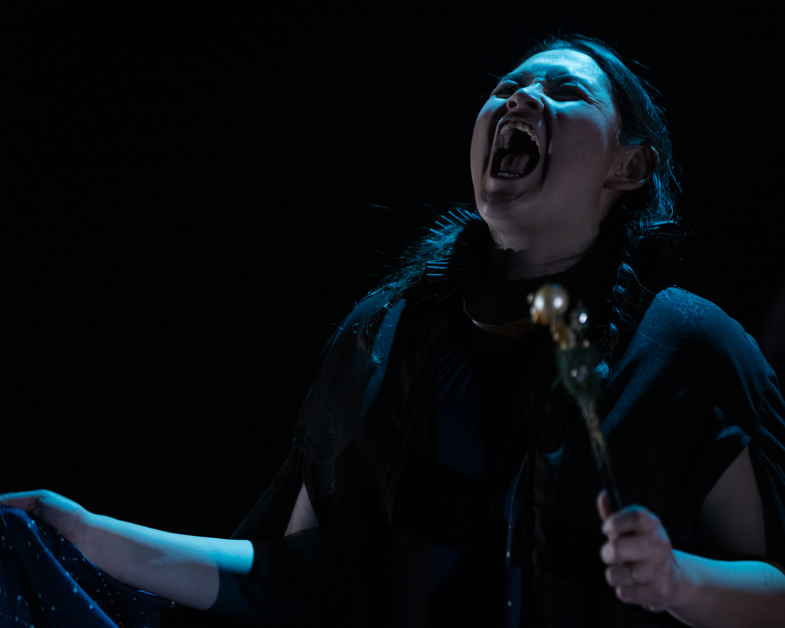 Unearthing and expanding The Tempest‘s most intricate of plots, this rich-language story is delivered with a clever tongue and an act of pure magic for the duration. Theatre Rusticle takes this story, overflowing with themes that circle around the act and art of freedom, love, colonization, and power, all in service to the pathways to truth. Told by five well-versed performers; Brefny Caribou, Jill Goranson, Beck Lloyd, Trinity Lloyd, and Annie Turna; the energetic cast embraces and plays to differing levels of success all of the fifteen-plus characters, passing them from one to another like a relay swim team who wants a chance to do battle with each and every stroke. It’s a wonderment in its wildness, as we sit back and watch Theatre Rusticle collide head-on with “all aspects of the “Shakespearean myth, magic, harsh history, and all the ways we make theatre“.
