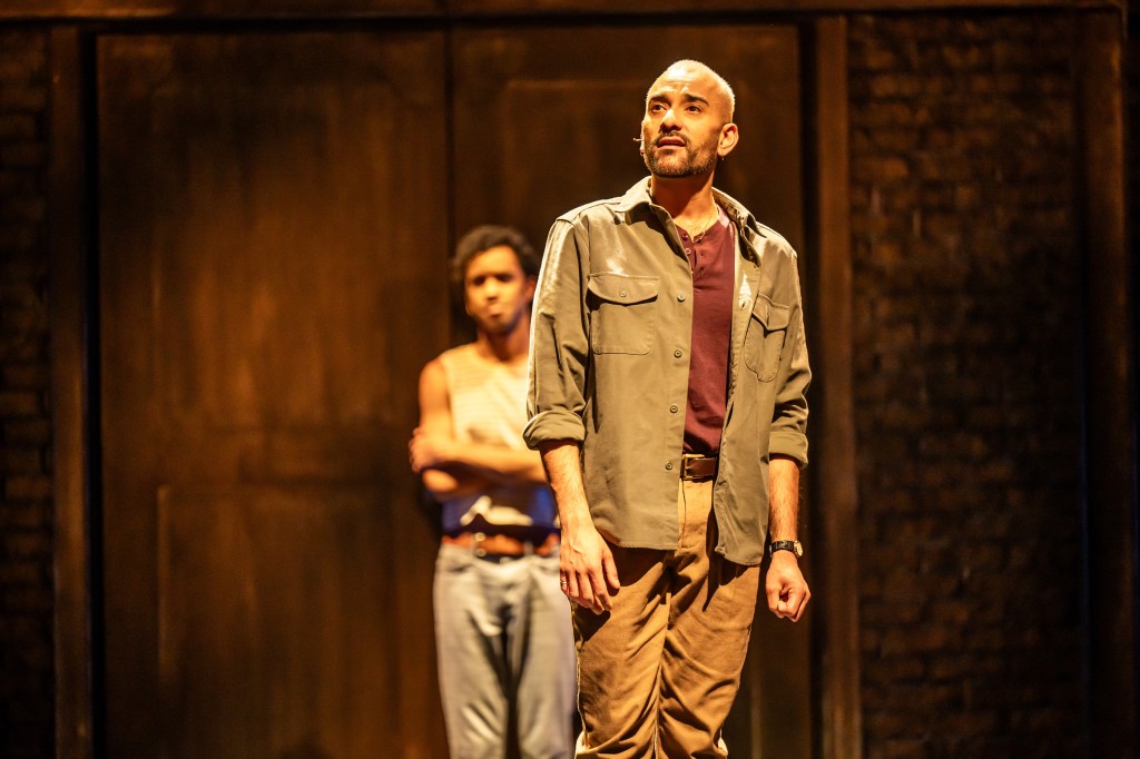 Qasim Khan with Stephen Jackman-Torkoff behind in Canadian Stage’s production of Matthew López’s The Inheritance. Photo by Dahlia Katz.