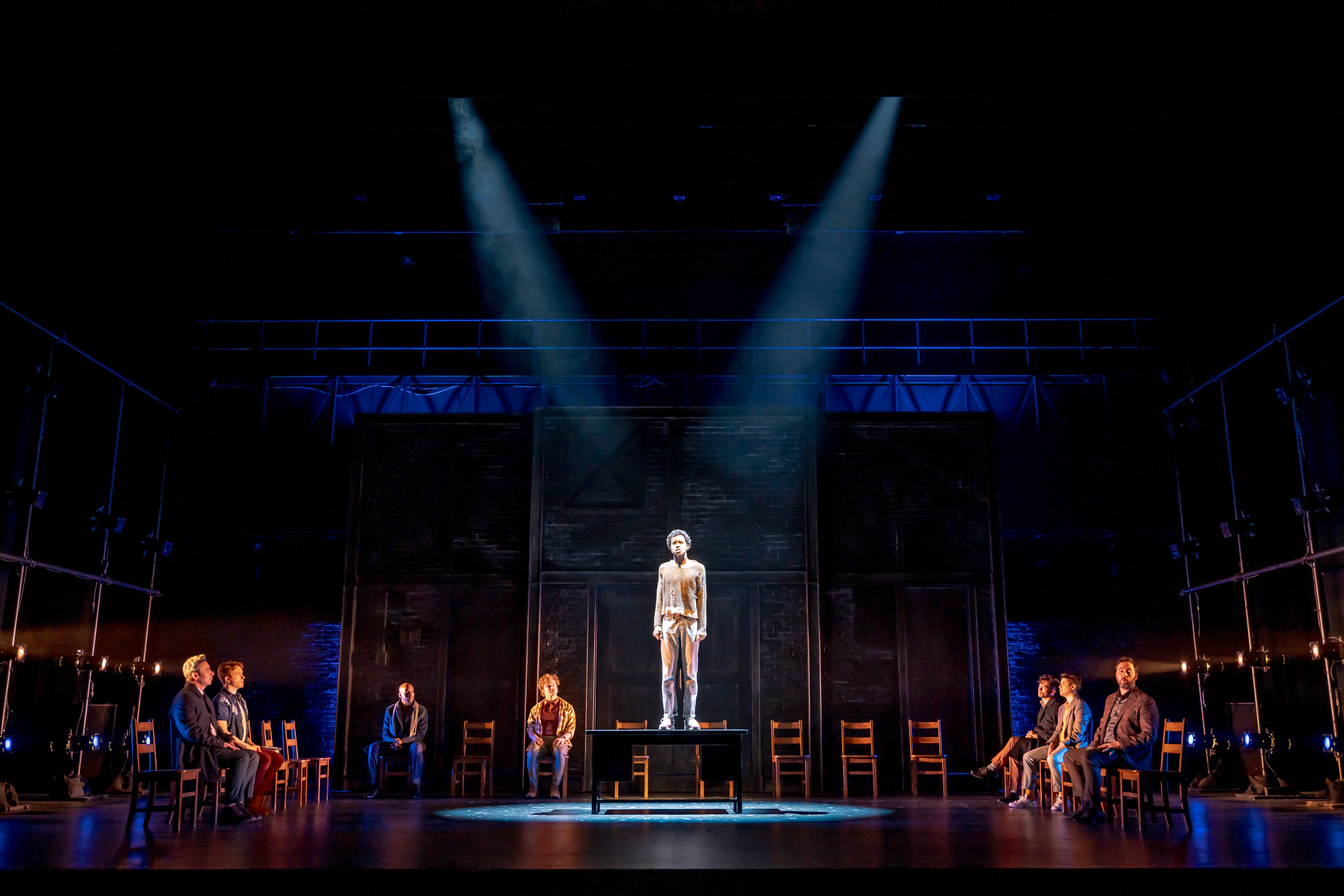 Stephen Jackman-Torkoff (center) with L-R: Salvatore Antonio, Landon Nesbitt, Hollywood Jade, Ben Page, Aldrin Bundoc, Breton Lalama, and Gregory Prest in Canadian Stage’s production of Matthew López’s The Inheritance. Photo by Dahlia Katz.