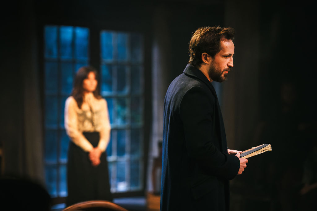 Hedda is smug and cruel, out of boredom and shallow emotional connection to others. She moves through the space like a caged lioness, under captivating lighting by Kaitlin Hickey (Factory’s Wildfire) with a strong sound design by Michael Wanless (Coal Mine’s Appropriate). Hedda initially only finds excitement in the eyes of their family friend and helper, Judge Brack, played suggestively and a bit overtly by Shawn Doyle (Canstage’s A Number). But that triangle only works with one rooster in it, the Judge tells the woman he wants to control, and once he sees the glint in Hedda’s eyes for the firebrand that is Lovborg, a different tension climbs up and out of its box. And like any caged animal unleashed, destruction must come for all those who get too close and demand too much.