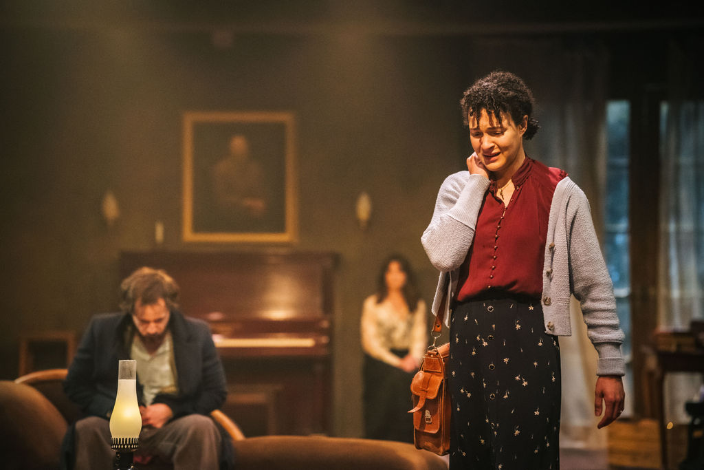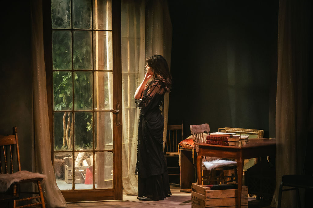 When the sweet Auntie Julia, played lovingly by Fiona Reid (Shaw’s Dance of Death), is ushered into the living room by an overwhelmed nervous Berta, played quietly by Nancy Beatty (“The Shipping News“), it is clear that there is tension in this newly acquired home of Hedda and her newlywed husband, Jorgen Tesman, played a bit too obviously by Qasim Khan (Canadian Stage’s The Inheritance). Jorgen is forever oblivious, even when prompted by the sweet maternalness of Auntie Julia. He doesn’t seem to see much beyond his books and personal interests, even when addressing the woman he has married and is completely spellbound by. Khan’s Tesman is a bit dense about marriage and what comes next, sailing in worlds that are oceans apart from his wife, especially when it comes to sensuality and seduction. It all flies over his head, but not ours.