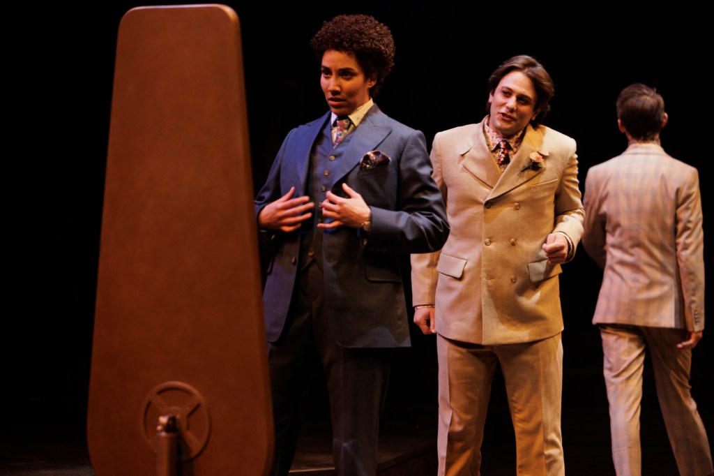 From left: Jessica B. Hill as Viola, Andrew Iles as Valentine, and Thomas Duplessie as Benicio in Twelfth Night. Stratford Festival 2024. Photo: David Hou.