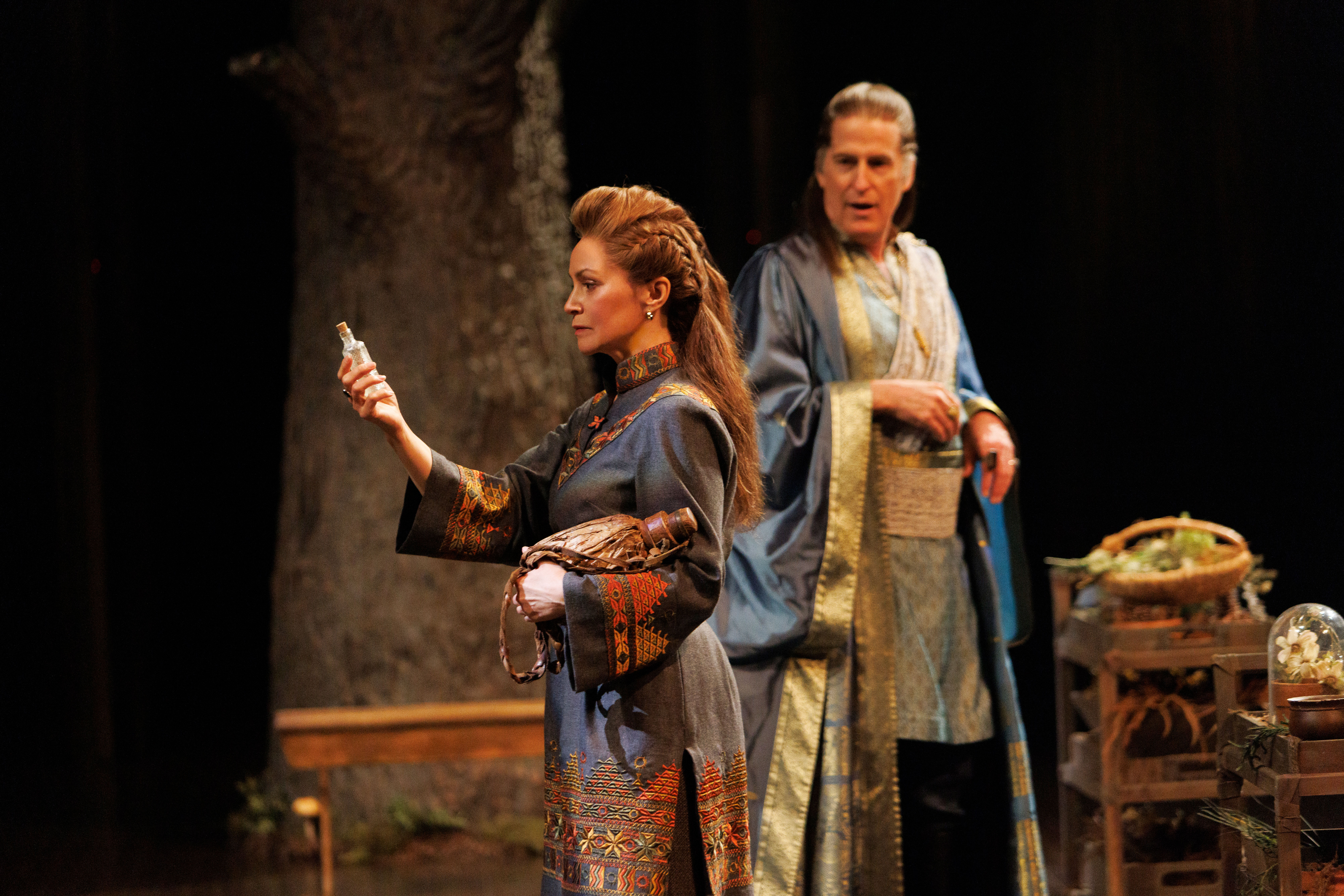 Directed with a magical force of nature by Esther Jun (Stratford’s Les Belles-Soeurs), Shakespeare’s complex and daunting Cymbeline, contains plot points that could easily overwhelm and entangle those in charge. They twist and envelope, like tree roots in the earth, but here at the Stratford Festival, Jun expertly finds a way to unravel and expand the many threads that are so thick and entwined. So clear and determined is her stance that the resolution in the final scene, which generally feels endlessly complex and never-ending, is greeted with clever wit, so much so that the main queenly character voices the overwhelming onslaught of information with an exasperation that almost every audience member can fathom and engage with. Yet we are in it, giving ourselves over almost immediately after the first whispers that come within the smoke.