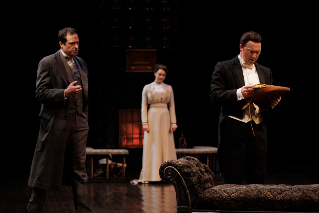 Brad Hodder as Lovborg (left) and Gordon S. Miller as Tesman with Sara Topham as Hedda in Hedda Gabler. Stratford Festival 2024. Photo: David Hou.