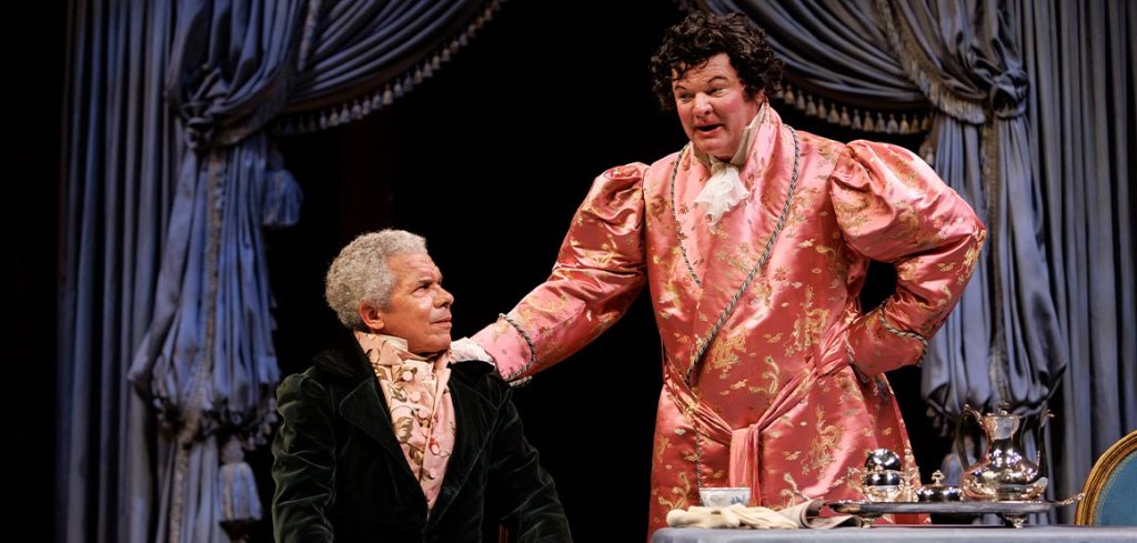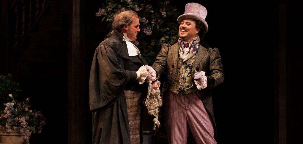 To be honest, I never found myself fully swept up in the play’s dramatic irony and swift asides explaining the scenes and the connections, but I think that’s more of a historical perspective than anything else. It’s the style of the times, one might say, leaning more towards an early Oscar Wilde sentiment than Shakespearian, but the fun that is created on that stage poking fun at those holding power and sway is joyfully produced and masterfully given, thanks to all involved. Sheridan’s The School for Scandal (1777), a play celebrated for its wit and satire, was written about 50 years before London Assurance (1841), and Wilde’s The Importance of Being Earnest (1895) was about 50 years after, and in that framing, we feel the advancement of Victorian satire in its roots. Boucicault sets off to skewer the arrogance of the rich, as any good satire likes to do, during a time when dandy types like the impossible-to-take-seriously Sir Harcourt Courtly were considered distinguished citizens and leaders of society.