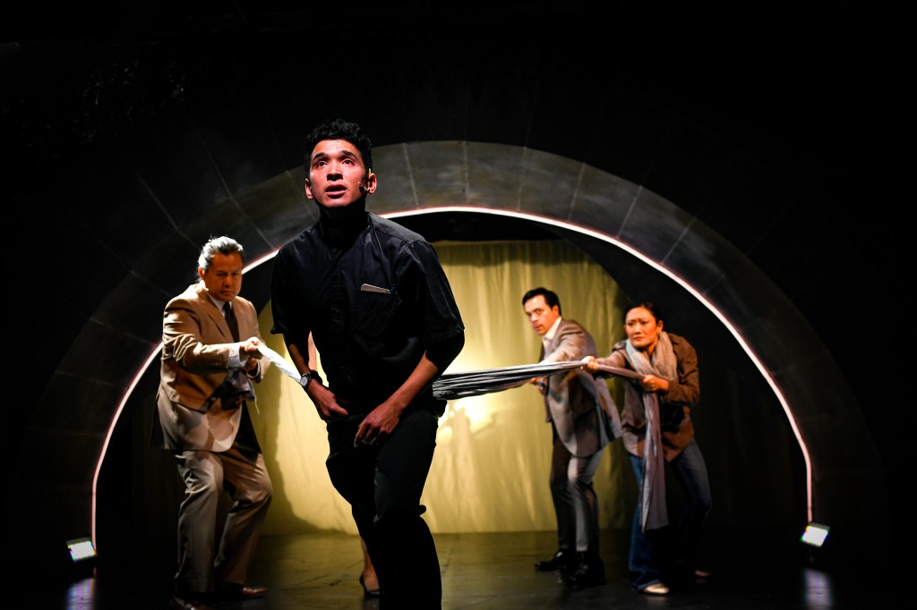 He decides, after the collar comes off, to play with the idea of miracles and faith, taking on and embodying what he thinks his Aunt Monica, played beautifully by Ann Sanders (MCC’s The Connector), who also delivered excellently in act one as The magnificent Medium, believes to be the powerful truth that hides behind religion. He formulates a plan to play with faith and belief, and after planting a handwritten seed, engages with several desperate participants: The impulsive lost Actress, well portrayed by the wonderful Marina Kondo (Encores! Off-Center’s Road Show), who did double duty as both Kesa and The Wife earlier; a homeless, former CPA, embodied by the vocally strong Kelvin Moon Loh (CSC’s Pacific Overtures), who also spirited in the role of The Husband in the first act; and The needy Reporter, portrayed cleverly by the powerful Sam Simahk (Broadway’s Into the Woods), who also played the challenging parts of Morito and The Thief in act one.