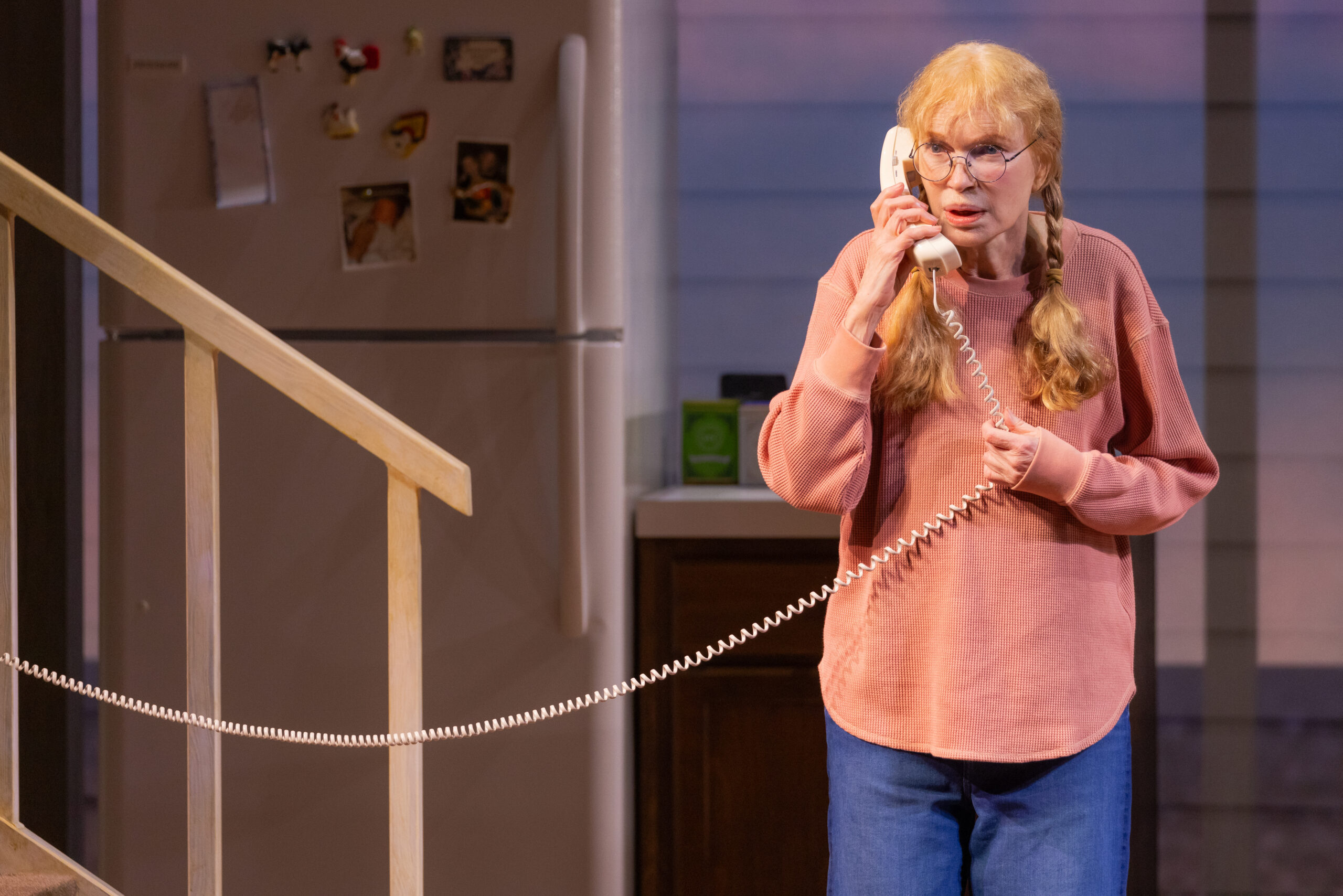 With only corn and wide open spaces surrounding this framing, The Roommate, a new play by Jen Silverman (Spain), unpacks itself, somewhat casually and over time, before us. It’s an entertaining enjoyable concoction that we have been gifted, with some of those boxes, unloaded from an unseen car stay, piling up on the side patio, symbolically and physically waiting to be brought in and unpacked by the uninspired Robyn (or is it Victoria?). So much is hidden, ignored, and denied in those somewhat wrongly labeled cardboard boxes, that we are as curious as the homeowner about what is inside. We know that feeling, in a matter of speaking. To throw away or to store in the back closet? That is the questions, and as portrayed forcibly and fascinatingly by the powerful Patti LuPone (Broadway’s Company; War Paint), Robyn is a mystery, enveloped in black leather, engaging in conversation yet giving off a reluctance to completely open up, or even move in after a multi-day drive from the Bronx. For reasons, at first, unsaid. She has made her way to Iowa – escaping some part of herself, perhaps – and landed, much to her surprise, at the home of Sharon, portrayed with detailed intent by the wonderful Mia Farrow (Broadway’s Love Letters; “Death on the Nile“), who has just retired herself from a marriage, and has no idea where to look.