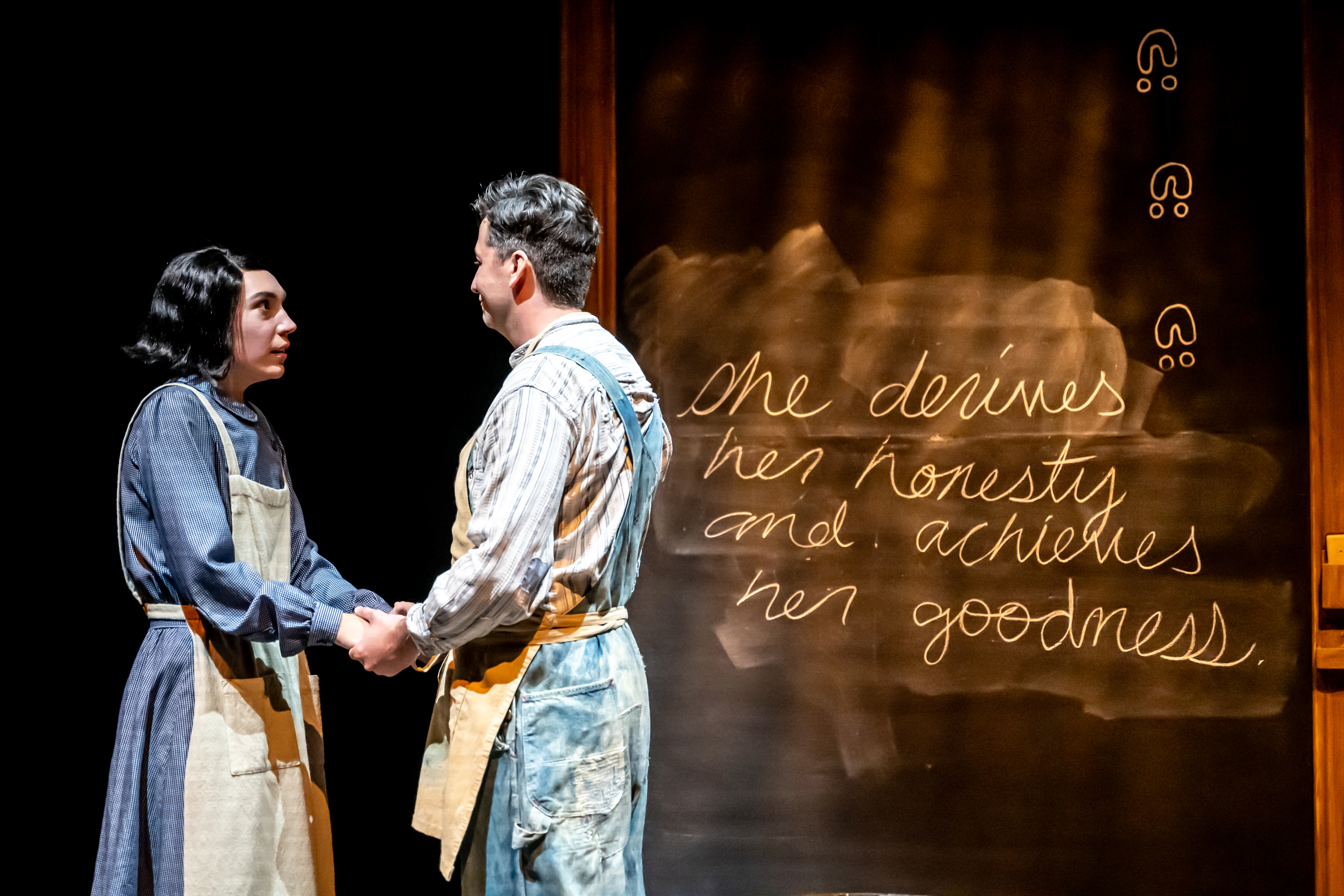 In 1939, the actors brilliantly do this subtle unpacking, all the while delivering forth a play that could be seen as a comedy if it wasn’t filled to overflowing with brutal reminders of the pain inflicted on these children, both seen and unseen. We have to remember throughout that these students, as portrayed with smart brilliance, are the favored ones; the ones that won’t try to run away or will not betray the school with comments about the trauma they are experiencing when people, like the visiting female journalist, Madge Macbeth, played to perfection by Amanda Lisman (Stratford’s Titus Andronicus), come into the room and start to ask questions. We can only imagine what the other students would say or do in a similar situation. But these five have found a way to pretend to be broken-in, and not be actually broken for good, even though they live in a nightmare situation, with heartbreaking memories and hidden knowledge that begin to float up from deep within as they discover the paralleled characters they are playing.