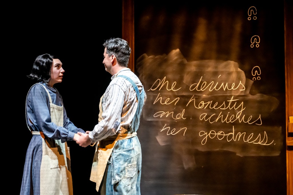 Written quite brilliantly by Jani Lauzon and Kaitlyn Riordan (Portia’s Julius Caesar), 1939 is a profoundly moving piece that will also have you laughing, as you also feel the tightness in your heart. It shines a solid illuminating light on those survivors of the Residential School system in Canada, that horrifically worked hard at wiping away any trace of Indigenous culture from the students and children who were forcibly removed from their families. All so that the Catholic Church, who ran these schools, could make them into “good little Canadians“. These school jails censored and tried to erase their words, their connections, and their language, much like the compellingly complex visuals that are so dutifully presented in this play as directed with care by Lauzon (Soulpepper/Native Earth’s Where The Blood Mixes). Words and phrases, written in chalk on the three boards that make up the backdrop of the set are, before they even have time to register, are erased with a casualness that is striking and upsetting. It’s that undercurrent of control that sneaks into the framing, created with simple elegance by set designer Joanna Yu (Stratford’s Salesman in China), with sharp lighting by Louise Guinand (Stratford’s Casey and Diana), that elevates the construct, giving the production a certain weight and meaning.