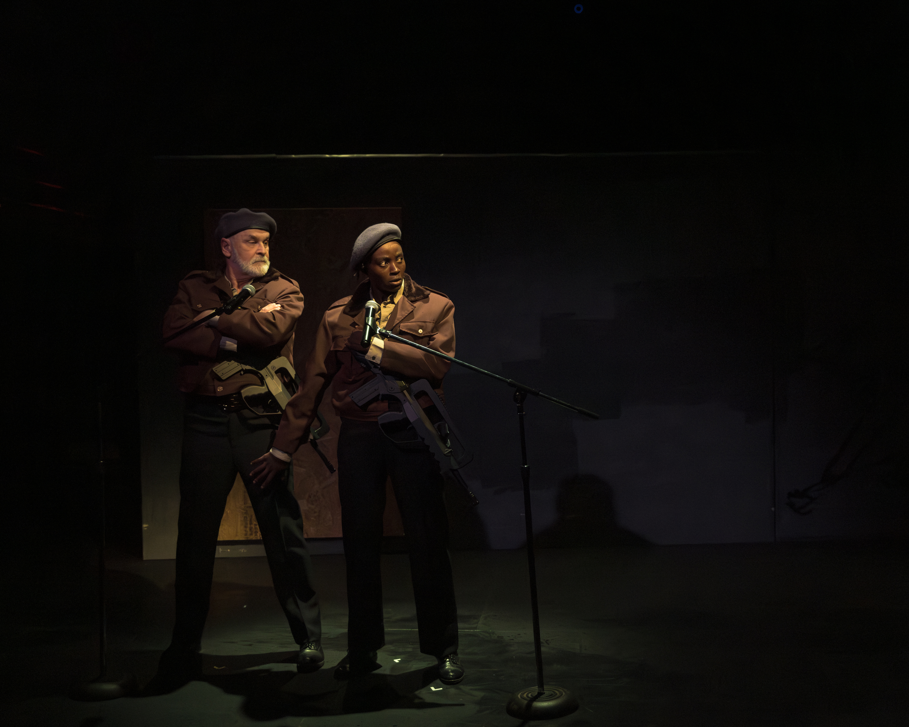 The play finds and unpacks formulas of absurdisms, first playing with a pair of well-cast security guards on a quiet night watch that is anything but, and then flowing into numerous monologues spoken to silent partners who stay mute to the barrage of words thrown their way. It’s “no easy job to be transparent,” inside a wonderland of well-phrased speeches delivered by well-tuned actors finding some sort of meaning in their ramblings. The actors excel in every role given, from ‘elegant lady’, a superb Highet, to ‘old gentleman’, delightfully embodied by MacIvor, against a wall of warnings as the police, beautifully and excitedly portrayed by MacIvor and Oladejo, meander garrulously in their search for the killing spree criminal.