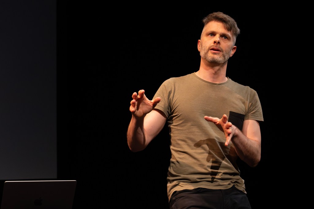 “If we are going to get through this, we need a roadmap“, he tells us. The well-articulated ideas brought tears to my blue Mohawk eyes, as he wisely brought it all home with statistics about plastics ingested into our bodies, piling up in our digestive systems, and the composition of the air we breathe as we sit listening with intention in this very theatre. We, as a collective, living on stolen colonialized land, trying to live the good life with care and dignity, are running the risk of denying it, even if that makes us feel better or less anxious. It’s not enough to give Land Acknowledgment, over and over again to the point when we aren’t even paying attention anymore. Humanity is an adolescent, opting for optimism, in our modern-day creation story. One question remains to be answered. Will we swim our way up to the surface, look at the fires raging in the horizon, and take notice, or will we be pulled out by the dangerous rip currents and drown ourselves in complicated denial?