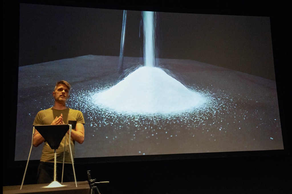 It’s a performance that intensely interweaves 75,000 years of humanity within an incredibly personal reframing, displayed in a cascading pyramid of sugar granules destined to challenge the way we look at things forever more. It is delivered engagingly, backed up with scientific research, phone footage, and an illuminating story about our transforming planet and how we have arrived at this troubling point in history. The movement through the piece vibrates at an intentionally high frequency, shifting our thought patterns around and about climate change and the impact it is having on us now, not in some abstract future. It’s not what will come, suddenly somewhere down the road, but something that is already happening all around us under our very feet. Facts aren’t enough to shift us into action, as both he and his father learned long ago. Intelligence must find its way forward, past fear and selfishness, into an arena where we can learn from our mistakes with each and every disaster that has come and is sure to come.