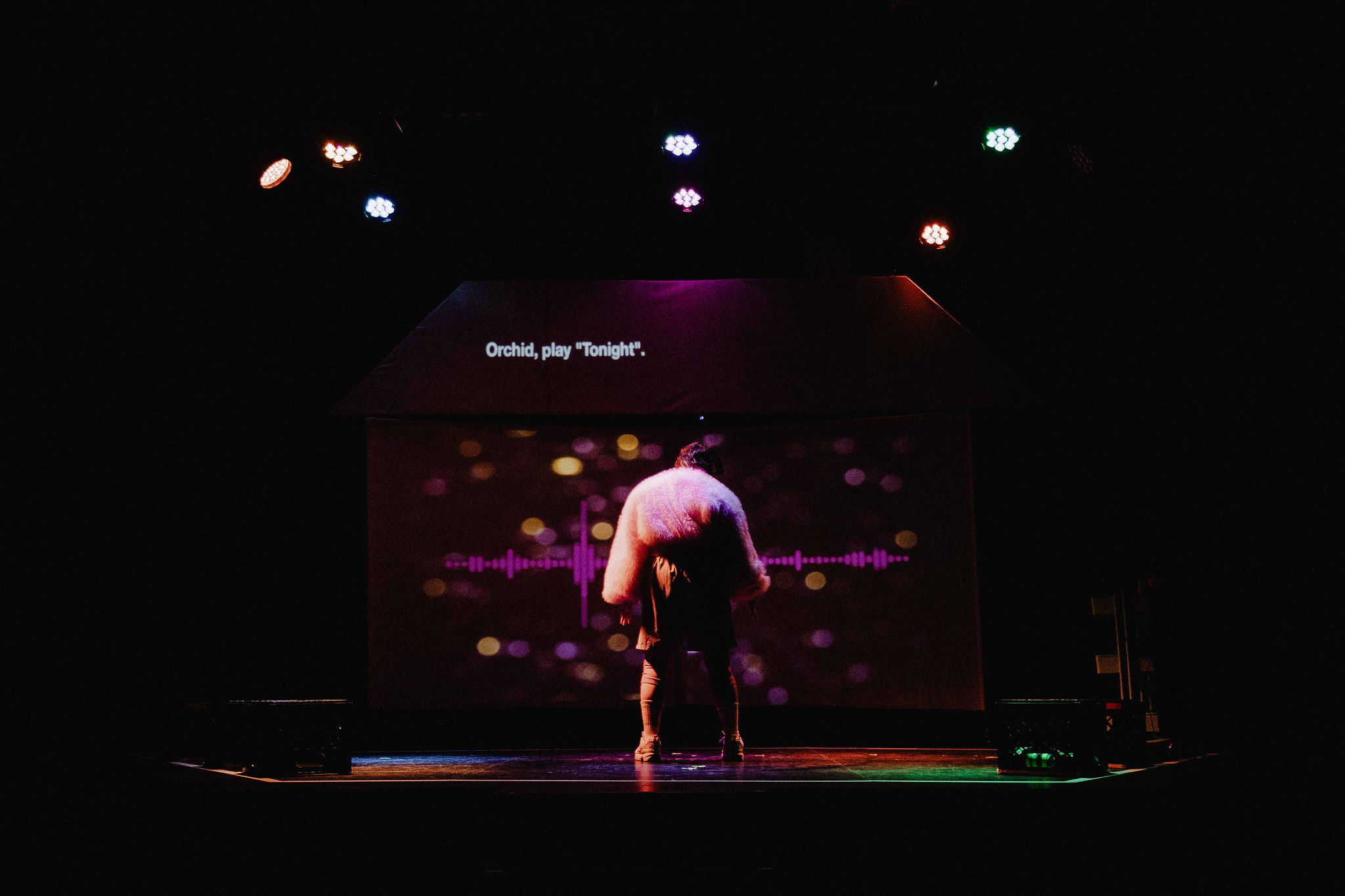 They give us a nervous wave into the darkness of Tiny Bear Jaws Productions and Factory Theatre‘s I Don’t Even Miss You, written and performed most magnificently by Elena Belyea (Smoke). This dystopian pop “solo” show magically creates an instantaneous connection to its lone character, brought on and delivered fantastically by the clever Belyea to engage us in their pseudo-autobiographical musical legacy creation set out before us. They ask their pseudo-gendered cohort, her A.I. collaborator and virtual assistant, “Orchid” who hangs around on the screen behind them, to play the song “Tonight“, and after a swell of synthesized music, our dynamic fearless guide, the non-binary computer programmer Basil Harris, dives deep into the song with all their ’90s heart and soul. Or at least it feels like something from the ’90s, effervescently choreographed by Gianna Vacirca (Factory’s BEARS), that ignites the space with a special kind of energetic abandonment that can’t be denied. It doesn’t last long, though. They pause, distracted by our captivated viewing, and after a moment to regroup, they nervously restart the program with the help, once again, of the obliging “Orchid“.