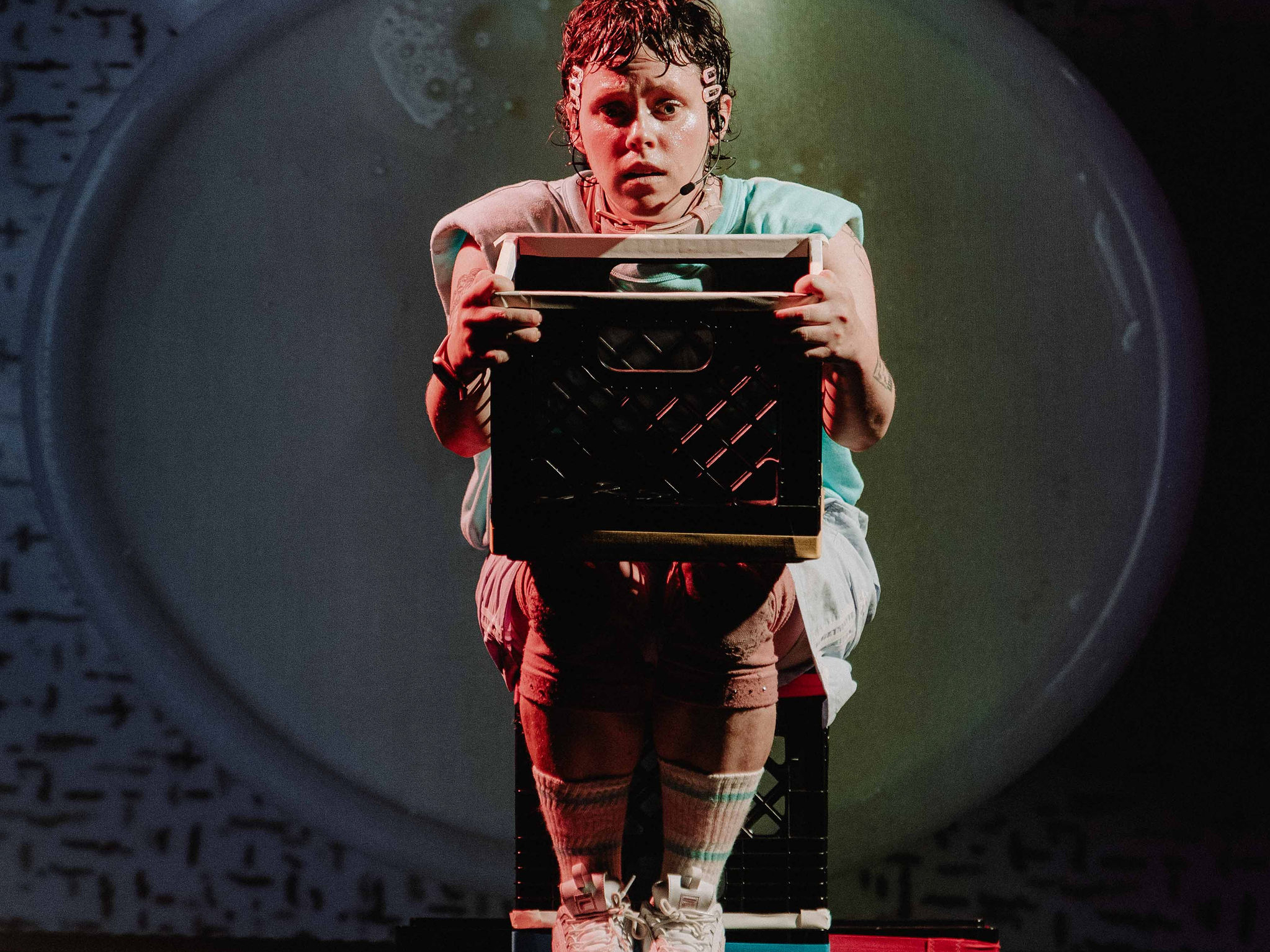 “That’s me“, Basil explains, “despite all we’ve been through“, and we start to see the space differently as the chapters of their life spirit out and spin forward and back, projected with care by sound and video designer Tori Morrison (OTM’s R.A.V.E.). The unpacked puzzle pieces start to paint an inner landscape, coming together quite brilliantly as the mouthing of lyrics and the captivating storytelling deliver forth a moment of clarity and concern. Something has happened to everyone in the world, and Basil must spend the next few years trying to detach and re-attach themselves to their new solitary reality using all the gifts they were generously given.