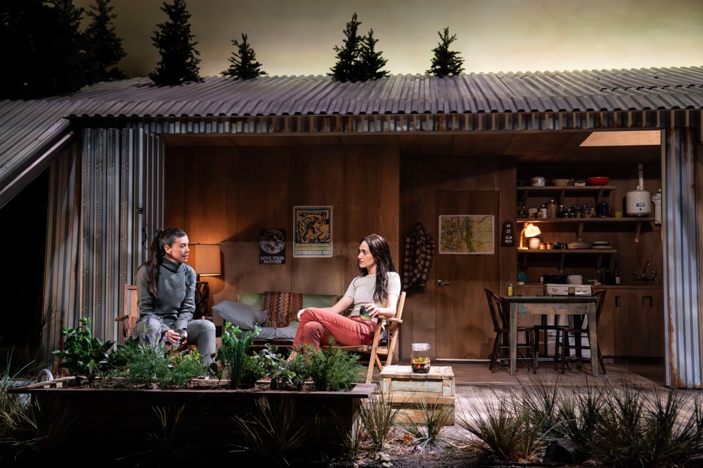 Yet, hidden away in this cleverly envisioned remote cabin in the woods, impeccably designed by Matt Saunders (LCT’s Pipeline), a former NASA architect is working hard to “act happy.” Stella, embodied beautifully by an engaging Emmy Rossum (“Shameless“) is building and growing a newly redesigned life with a climate-conscious Earth Activist by the name of Bryan, passionately and handsomely played by the deliberate Motell Foster (“La Cocina“). Their low-impact habitation, consisting of a stunningly constructed cabin with fold-away walls, a slanted metallic roof growing evergreens, and a well-cared-for vegetable garden that nerd Stella has named “Middle Earth“, lives and breathes just over there beyond our vantage point. Dynamically brought to light by lighting designer Adam Honoré (Broadway’s Ain’t No Mo’), the space takes on the serenity and power of the trees and the sound of crickets, brought to energetic life by sound designer Lee Kinney (Broadway’s Is This A Room), and if there is any peace to be found in this world, future and now, this is the place.